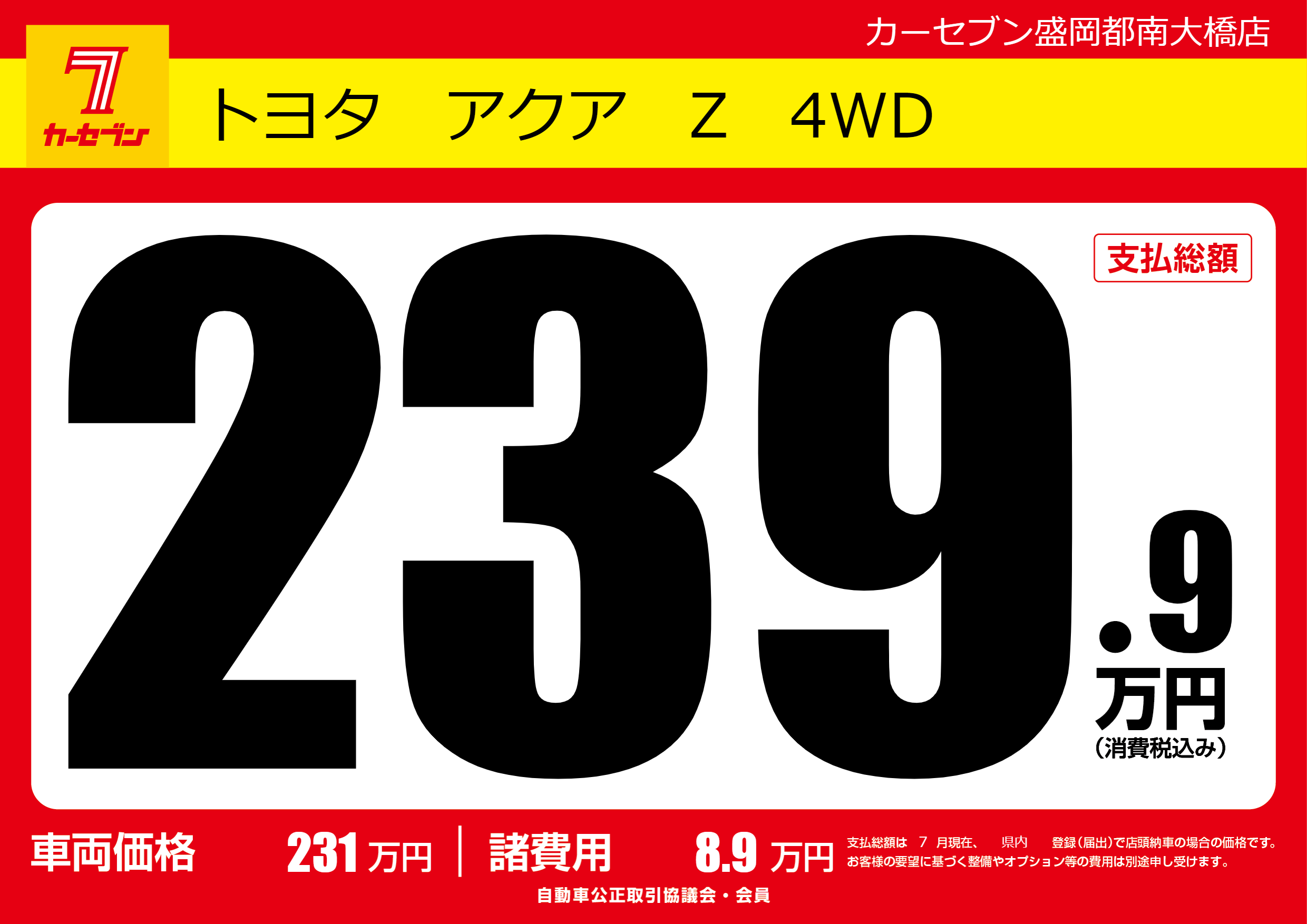 | 車名 | トヨタ アクア Z 4WD | グレード ミッション 排気量 |