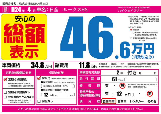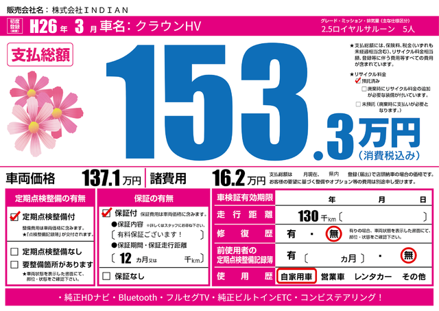 保証付き 保証内容(有料保証ございます。) 1ヶ月または(1)千kmまで |
