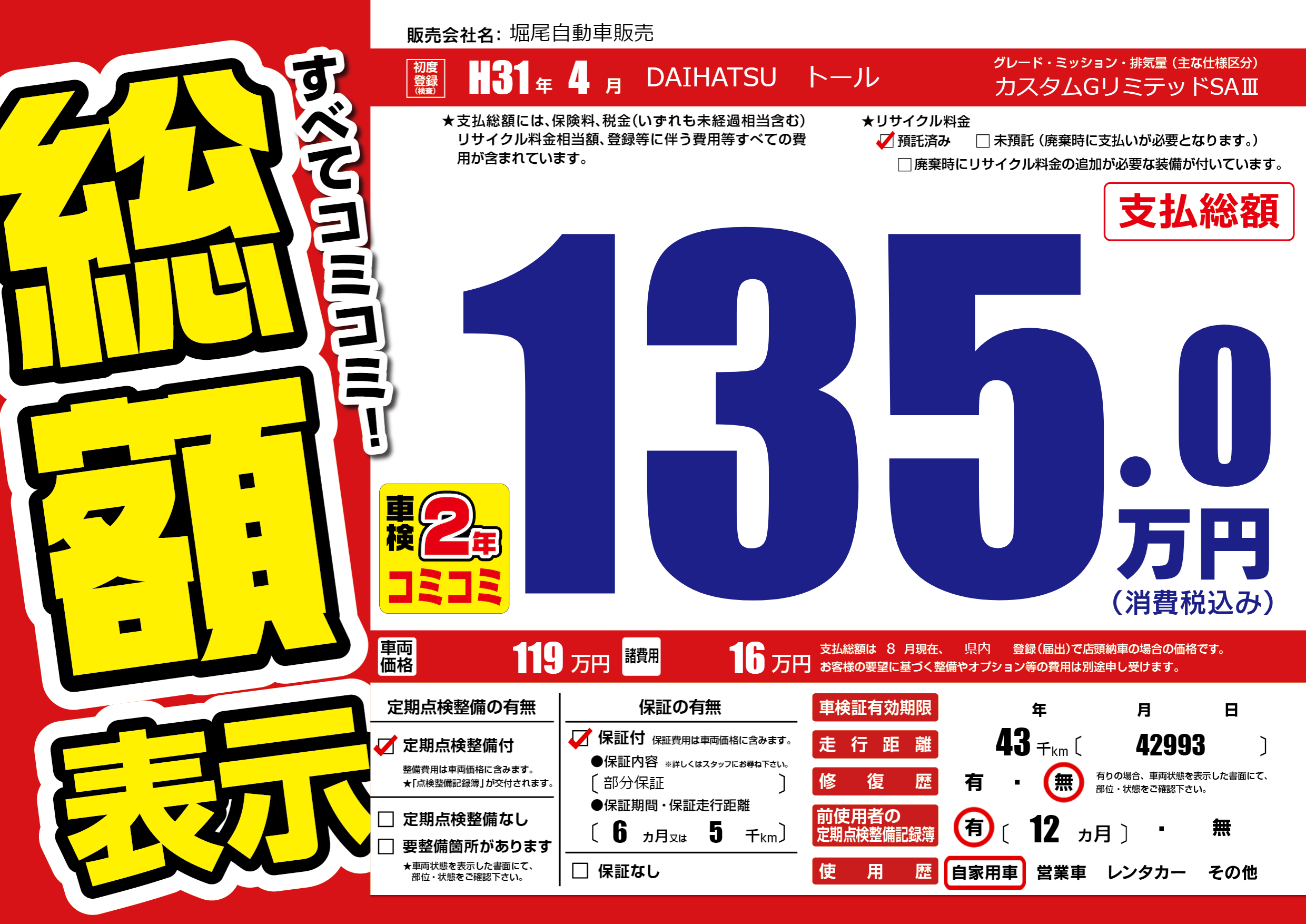 | 走行キロ | 4.3万km | 初年度登録 | H31年4月 |