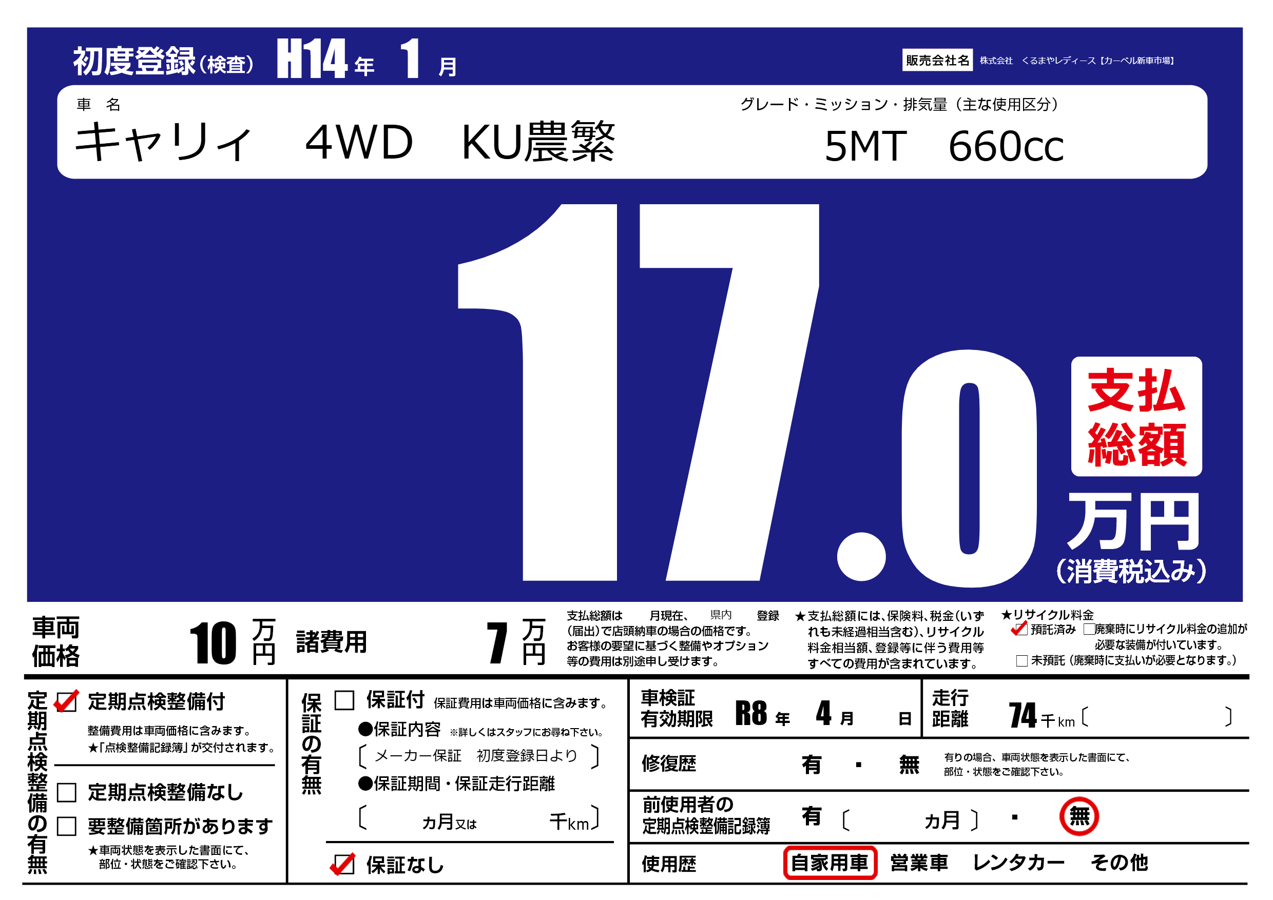 | 走行キロ | 7.4万km | 初年度登録 | H14年1月 |