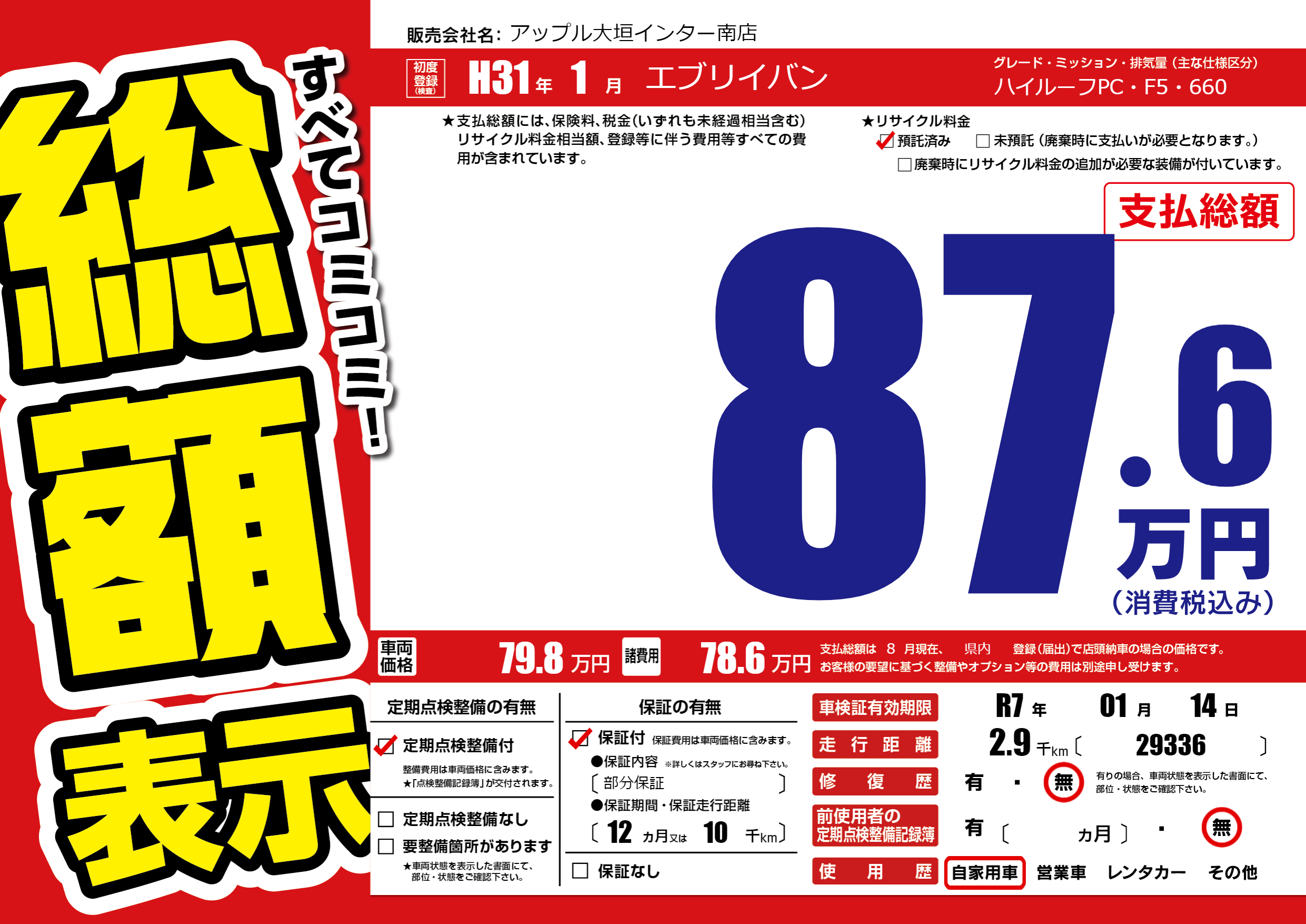 | 車名 | エブリイバン | グレード ミッション 排気量 |