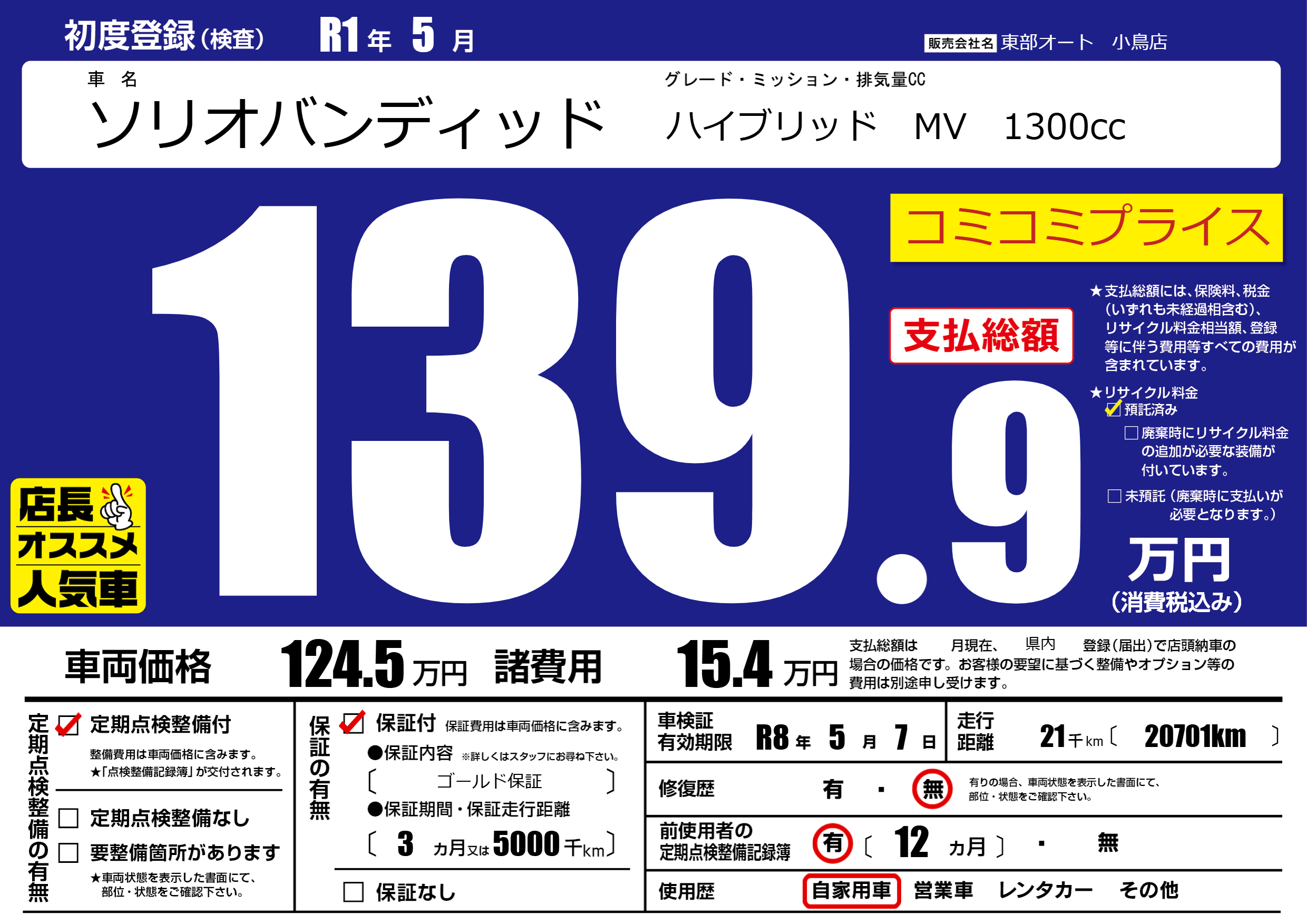 あり | リサイクル預託金相当額 | ( 0円)が別途必要 |