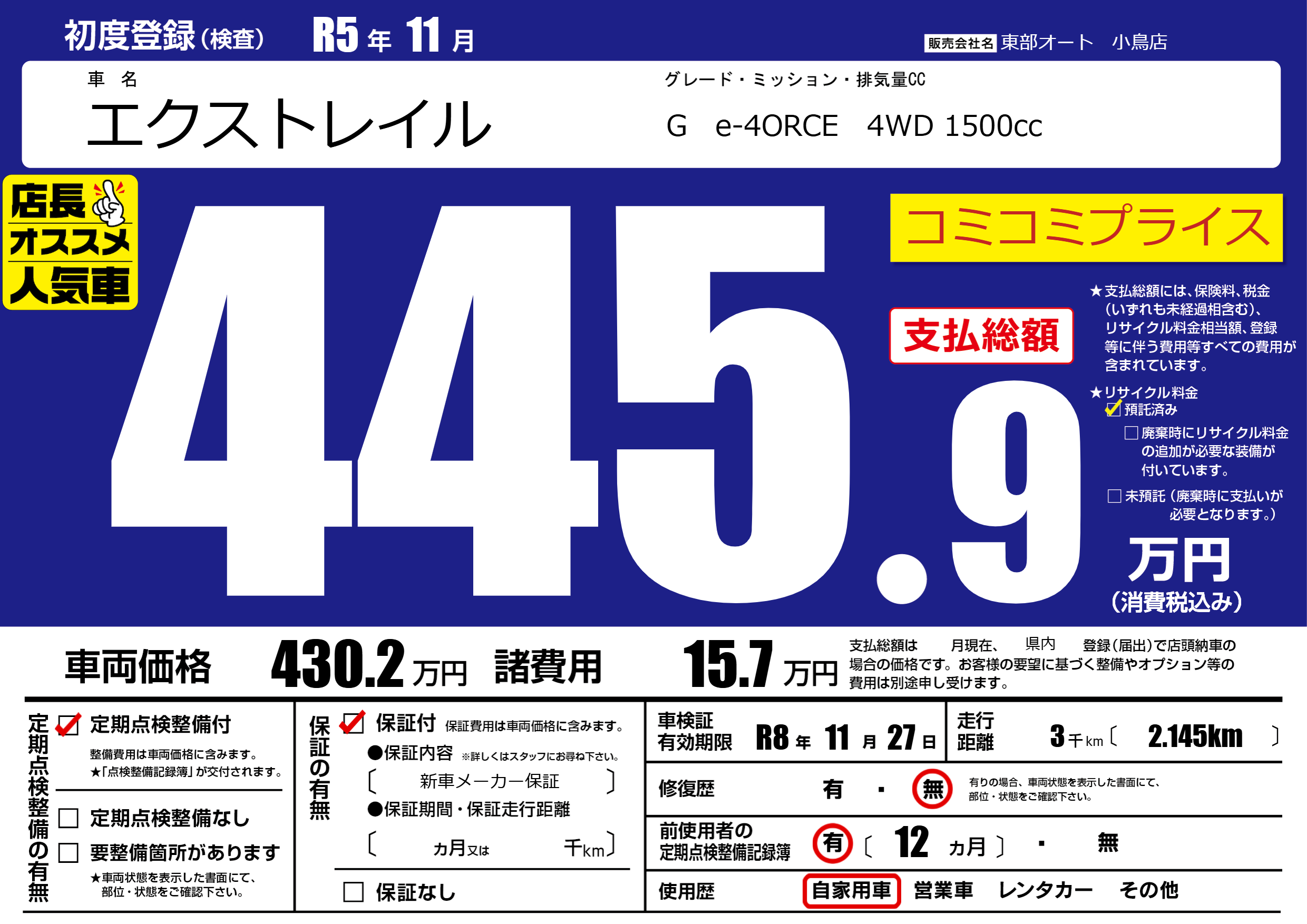| 走行キロ | 0.3万km | 初年度登録 | R5年11月 |