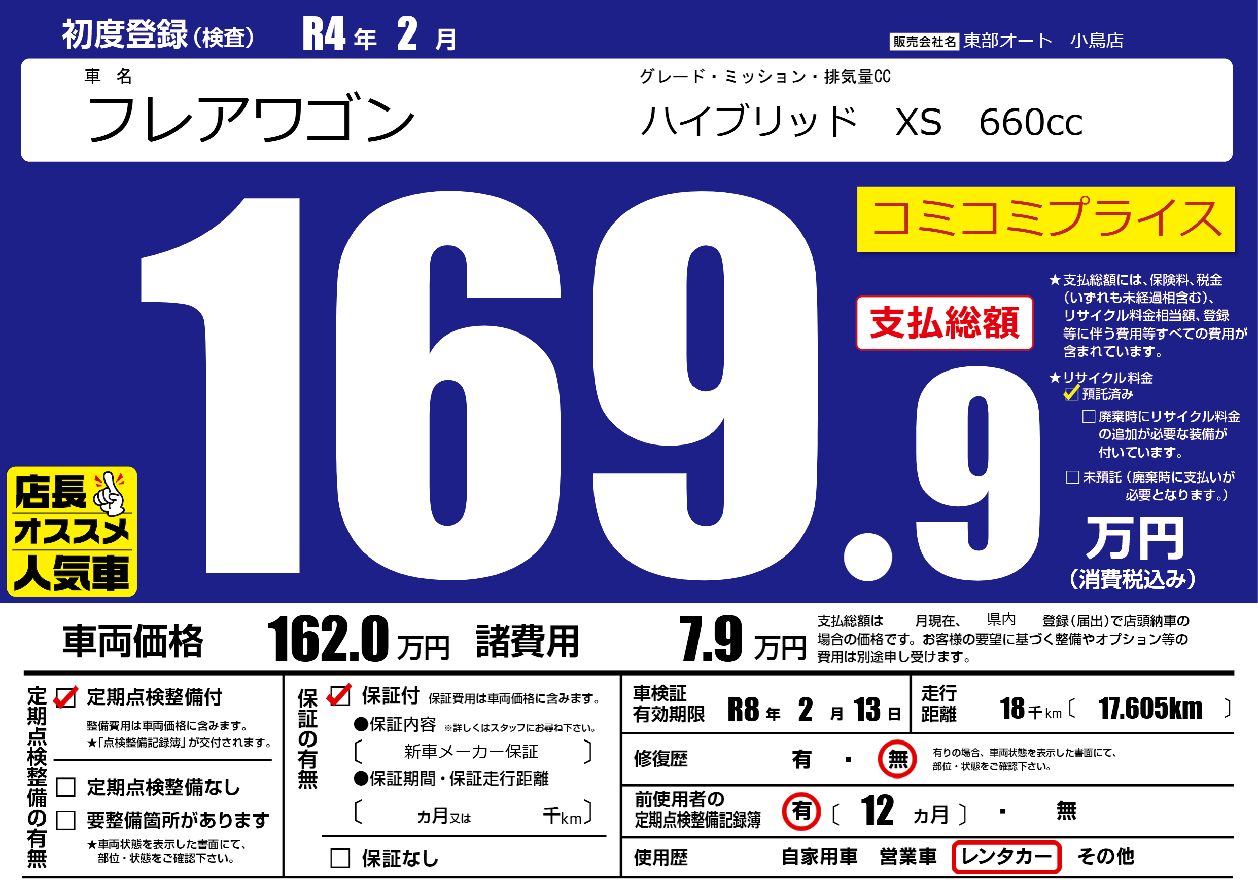 | 車名 | フレアワゴン | グレード ミッション 排気量 |