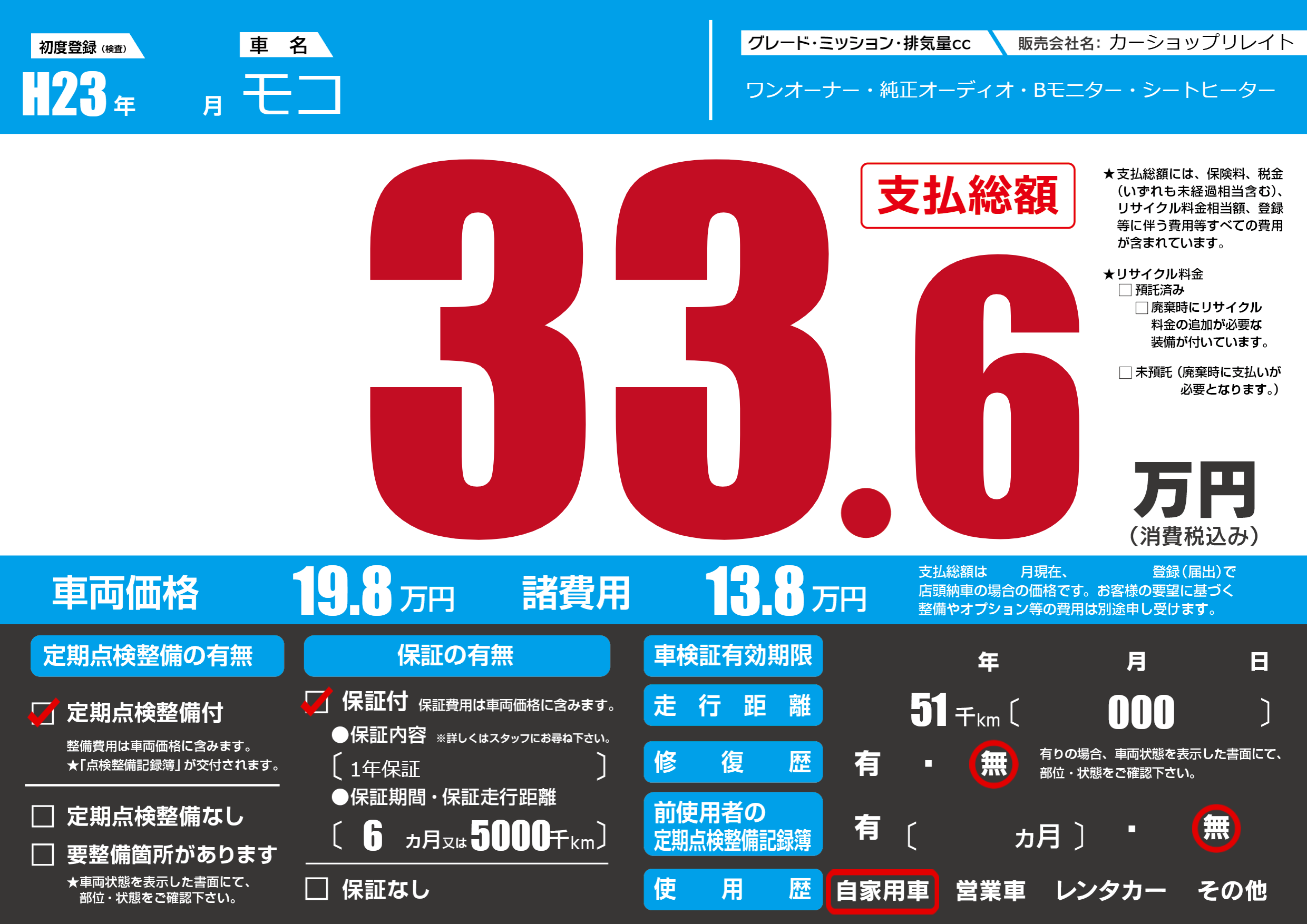 | 走行キロ | 5.1万km | 初年度登録 | H23年---月 |