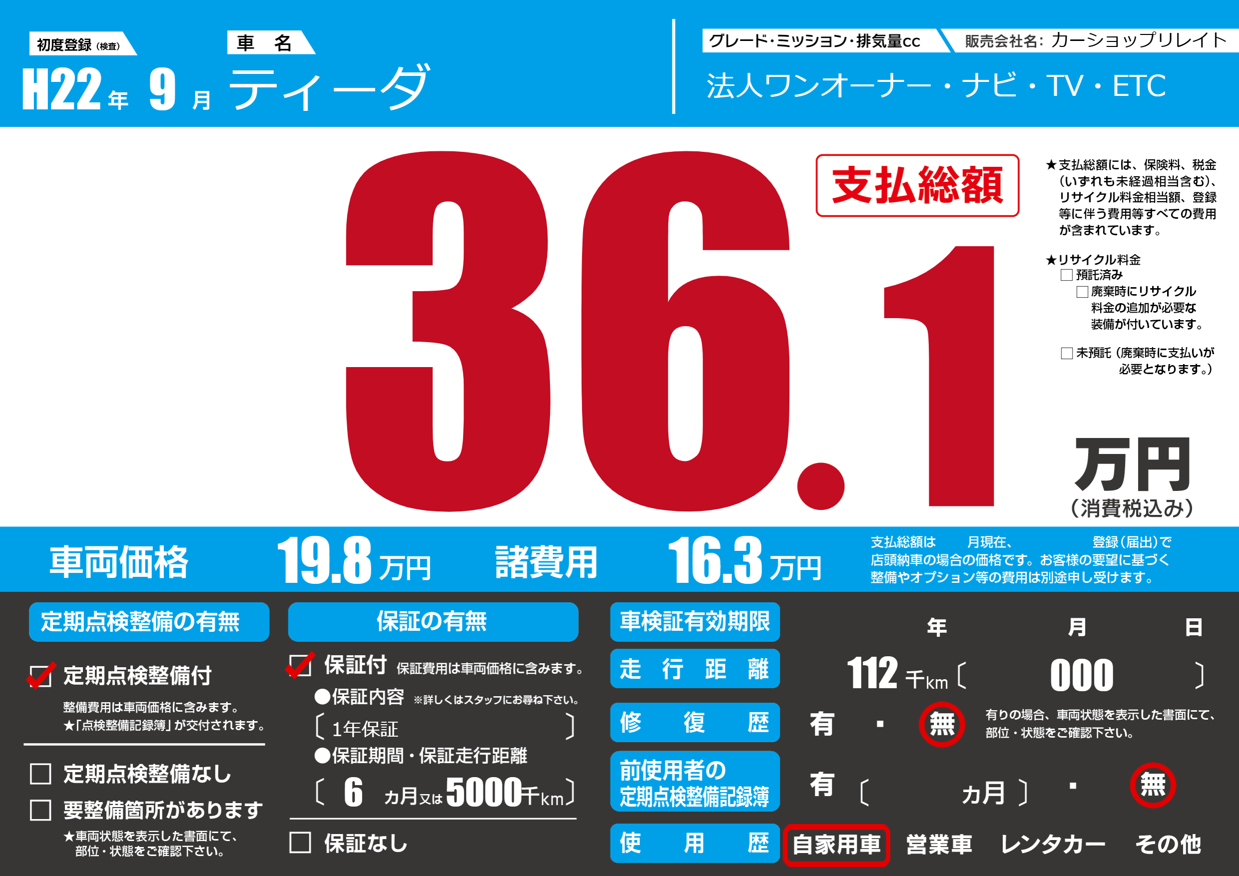 | 車名 | ティーダ | グレード ミッション 排気量 |