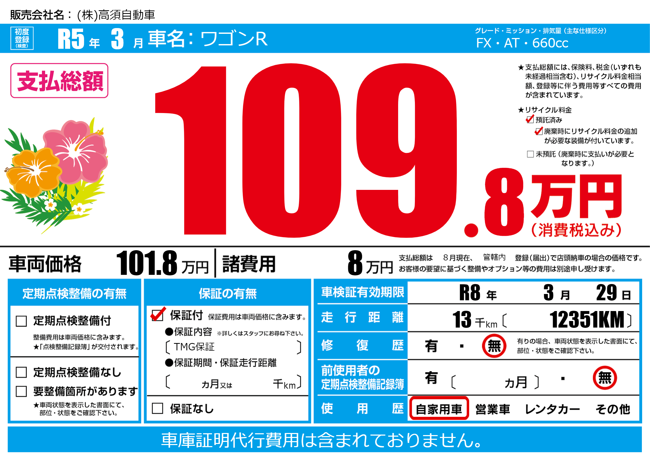 | 車名 | ワゴンR | グレード ミッション 排気量 |