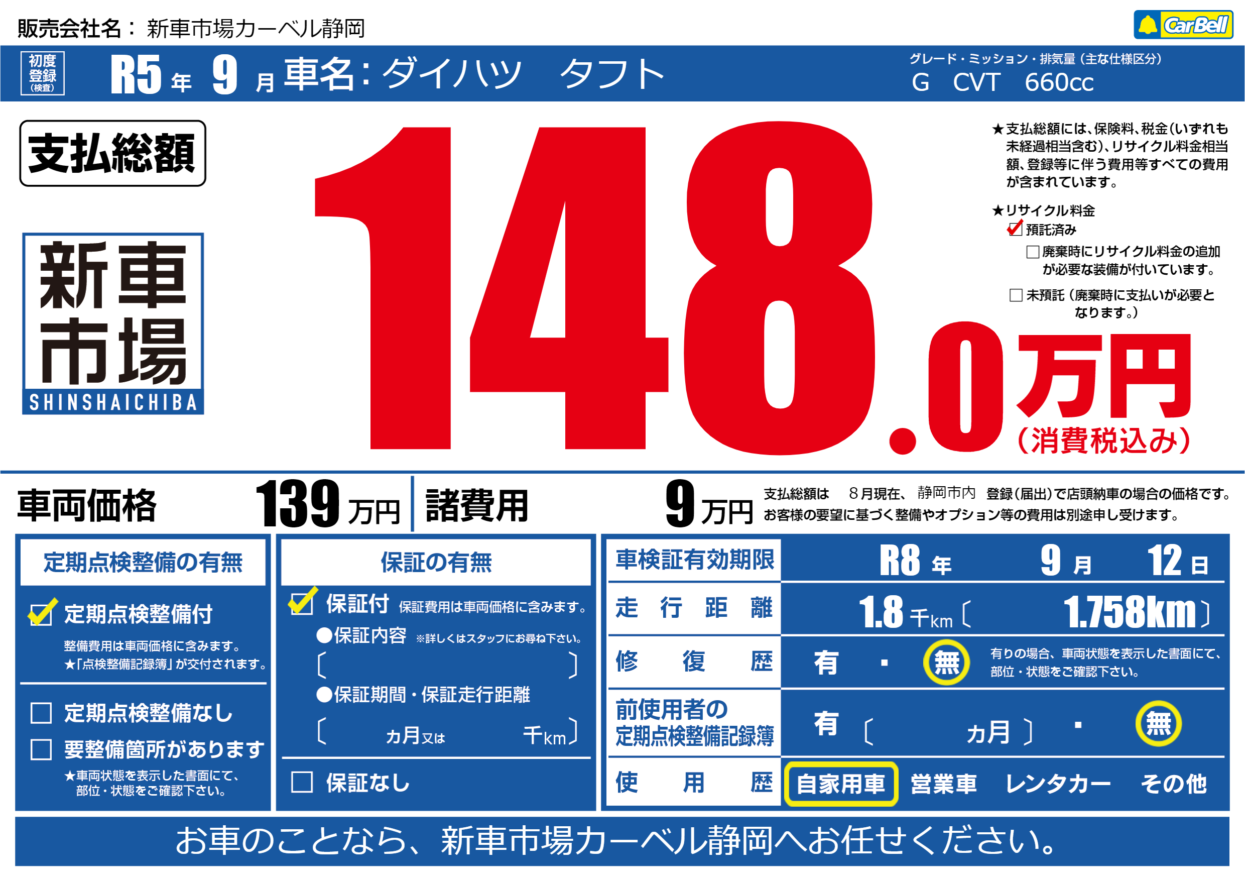 | 走行キロ | 0.1万km | 初年度登録 | R5年9月 |