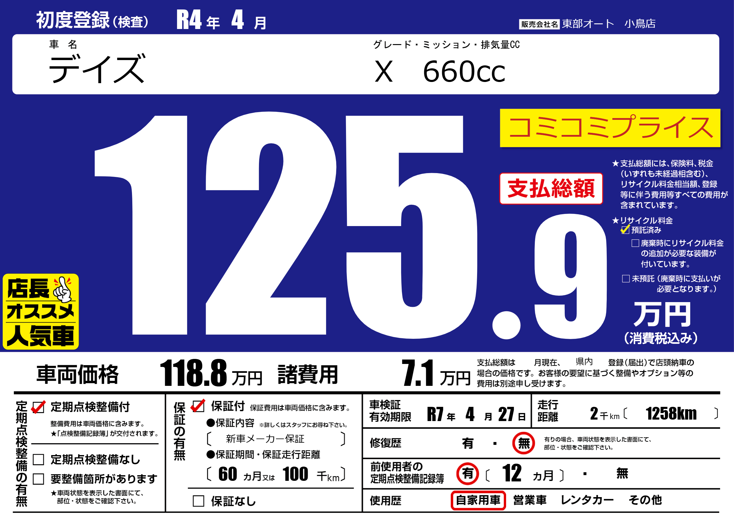 | 車検制限 | R7年 4月 27日 | ||