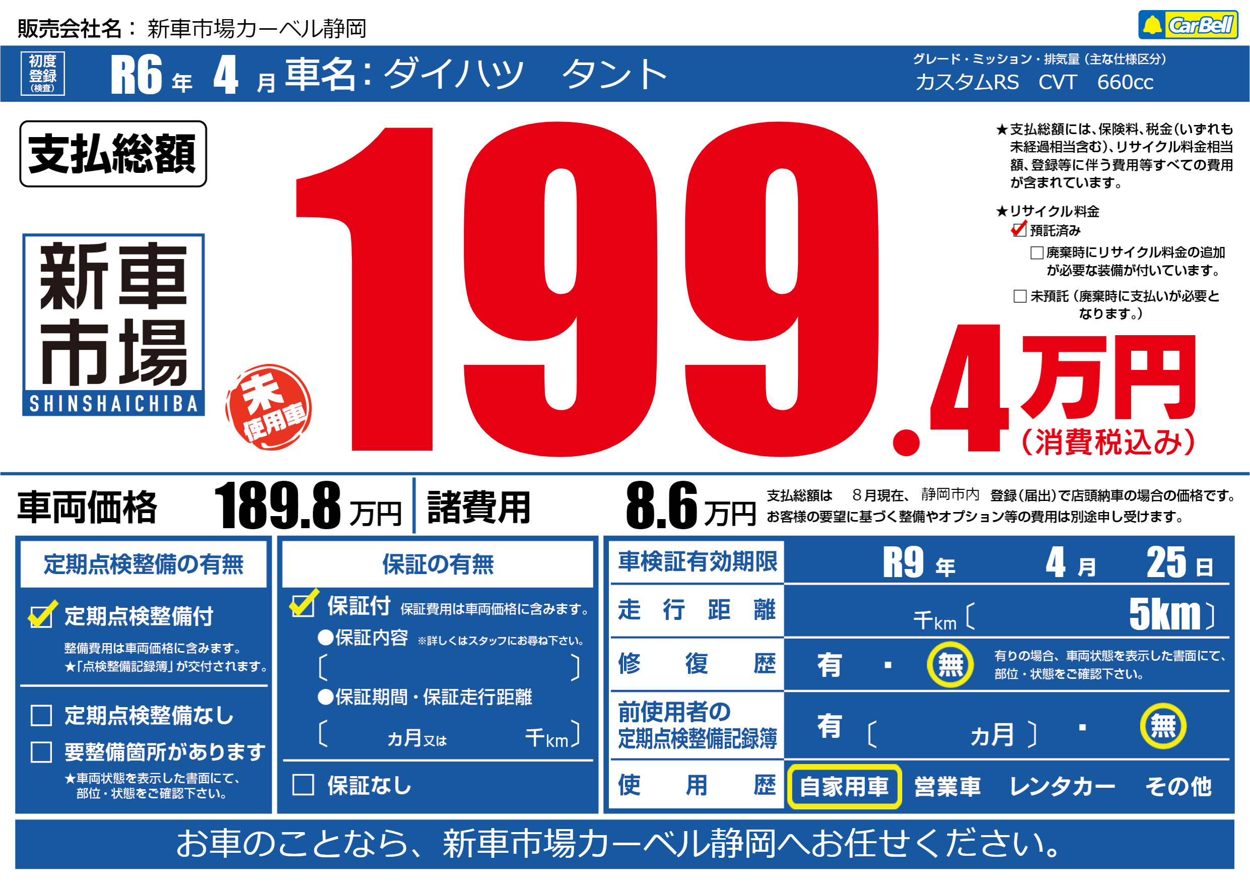 | 車名 | ダイハツ タント | グレード ミッション 排気量 |