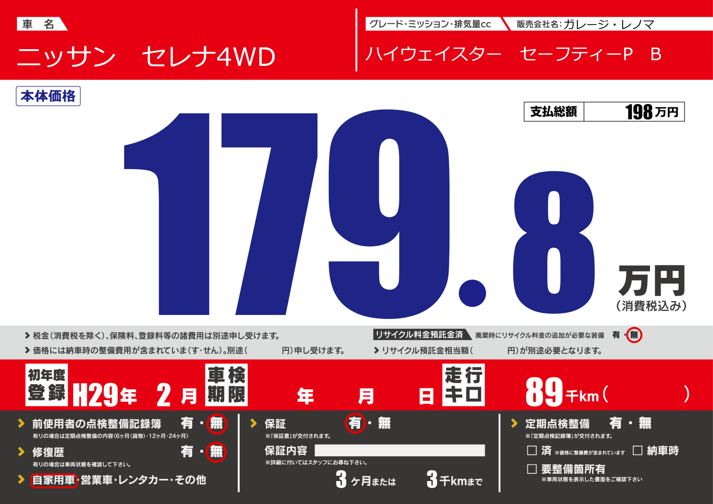 | 車名 | ニッサン セレナ4WD | グレード ミッション 排気量 |