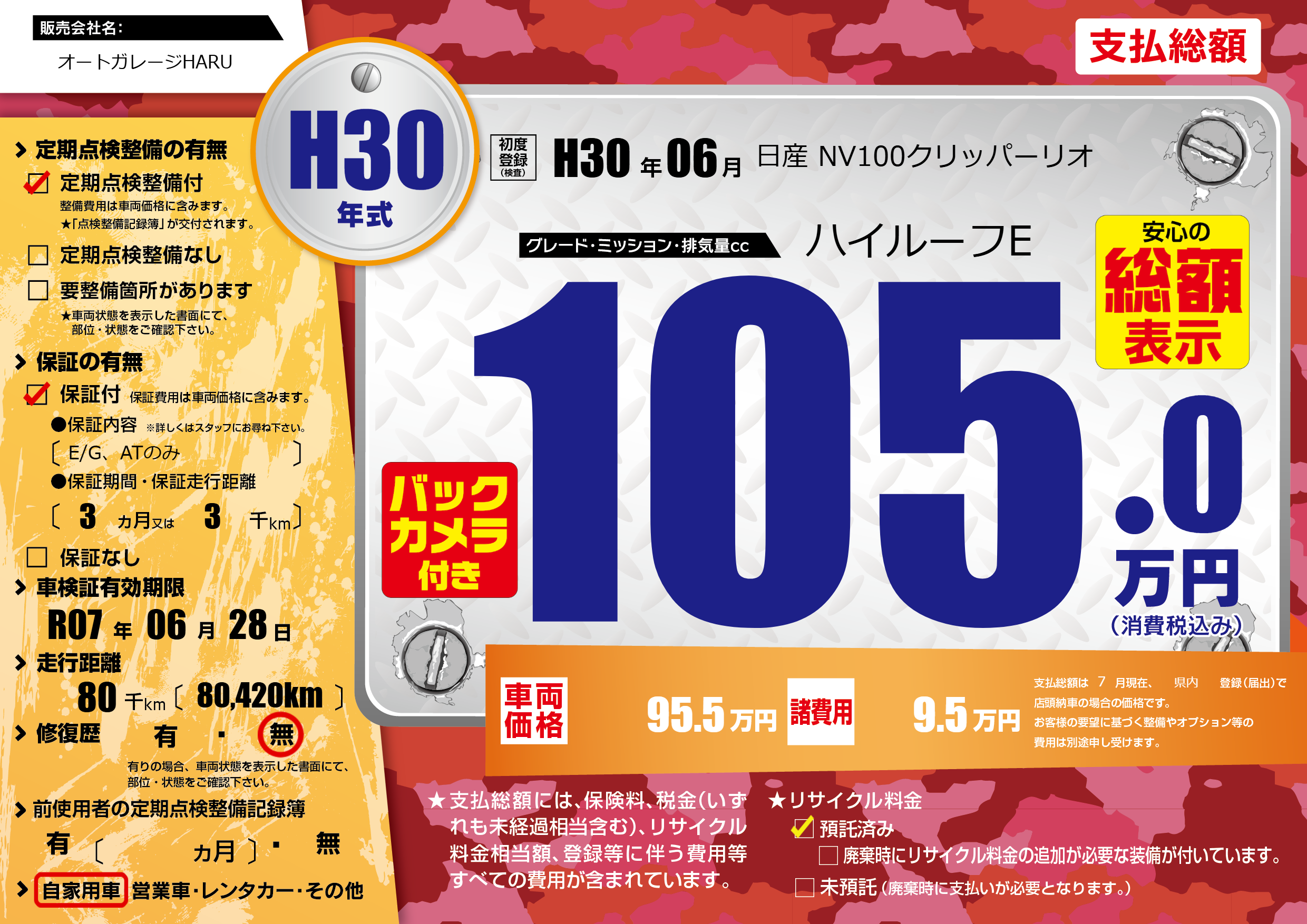 | 走行キロ | 8万km | 初年度登録 | H30年06月 |