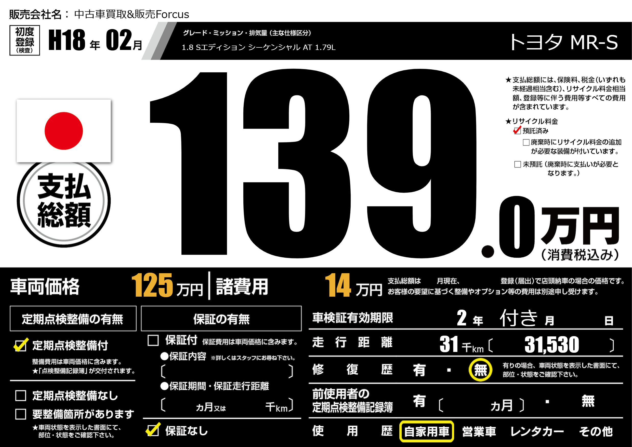| 車名 | トヨタ MR-S | グレード ミッション 排気量 |