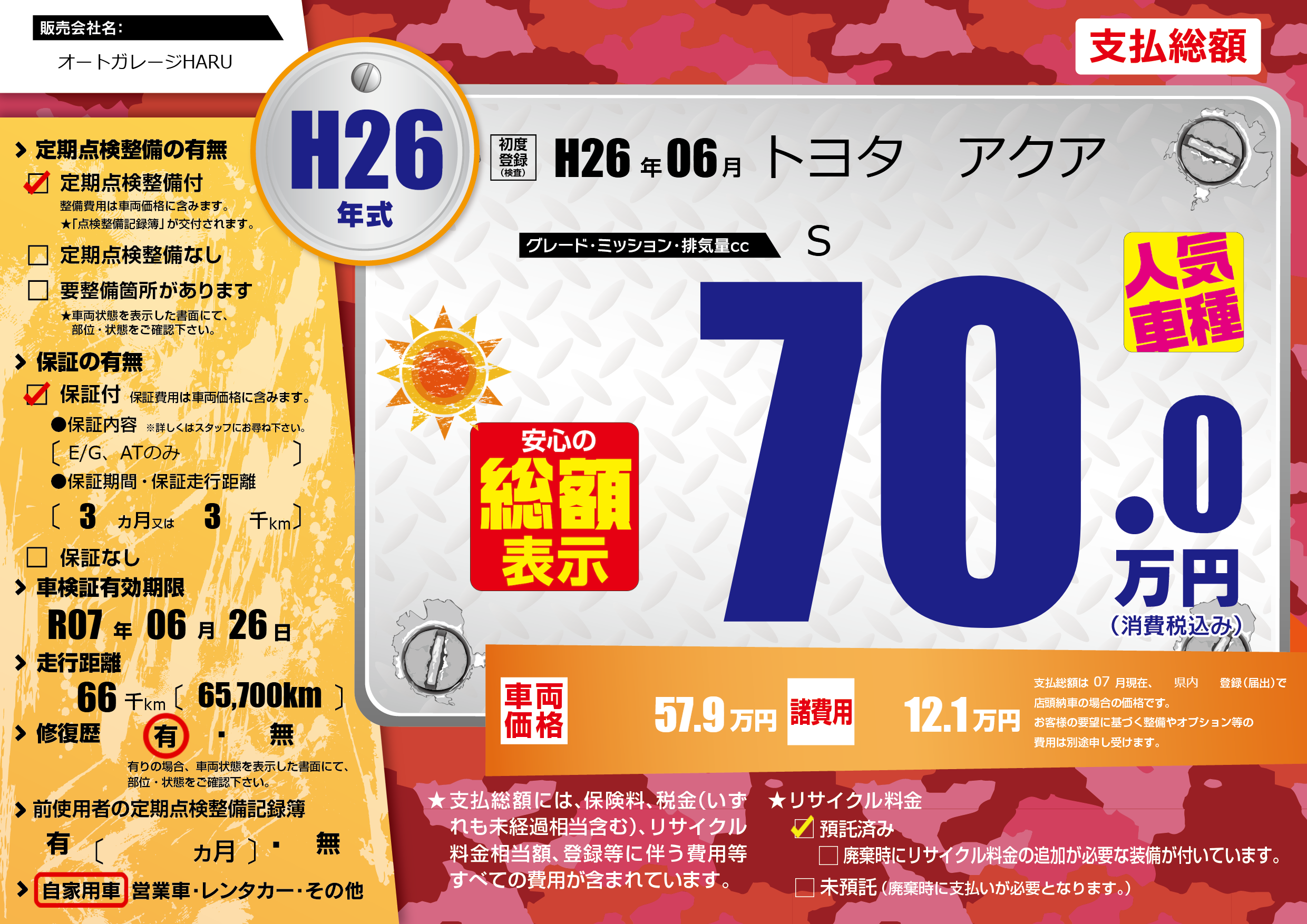 | 車検制限 | R07年 06月 26日 | ||