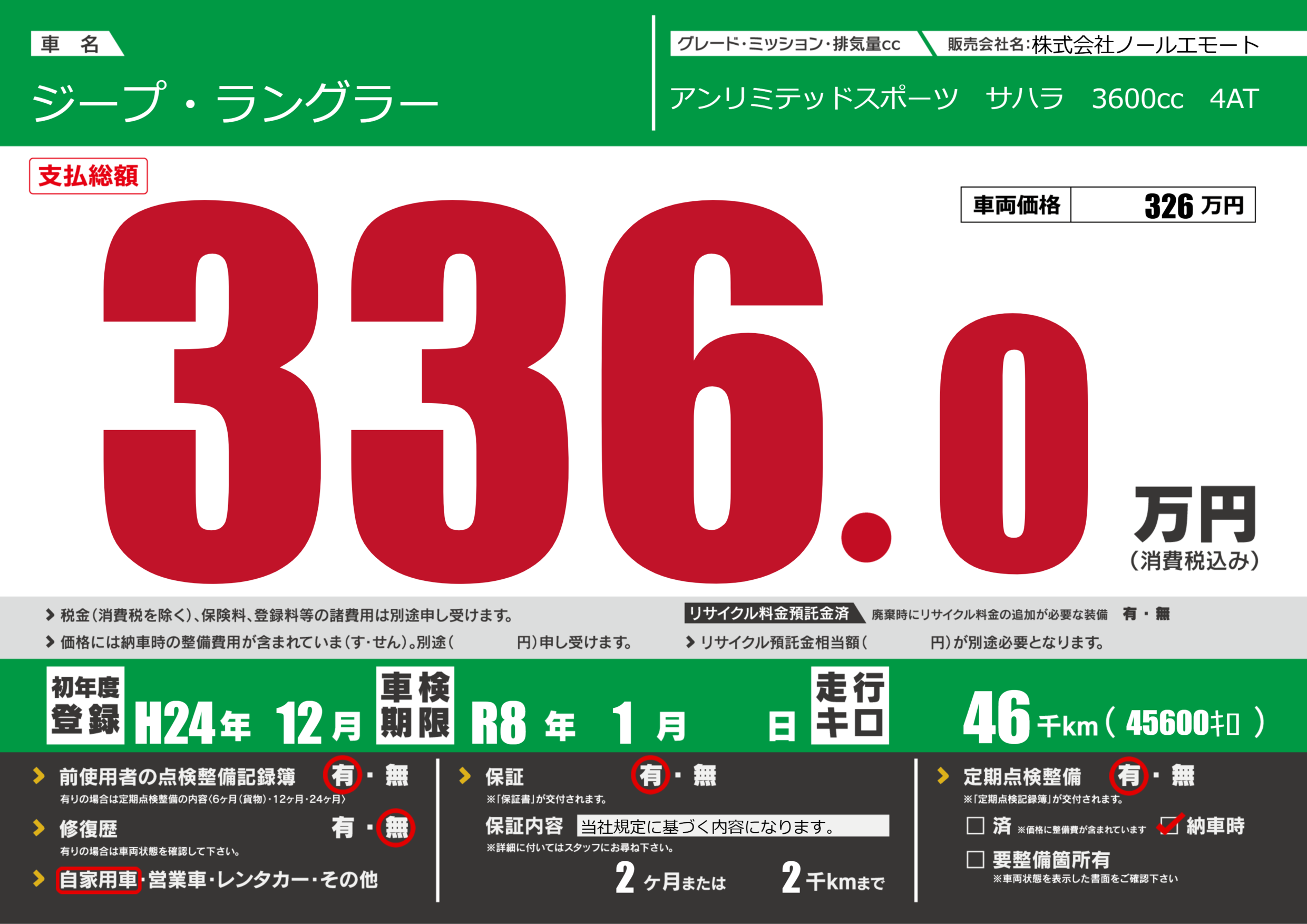| 車名 | ジープ・ラングラー | グレード ミッション 排気量 |