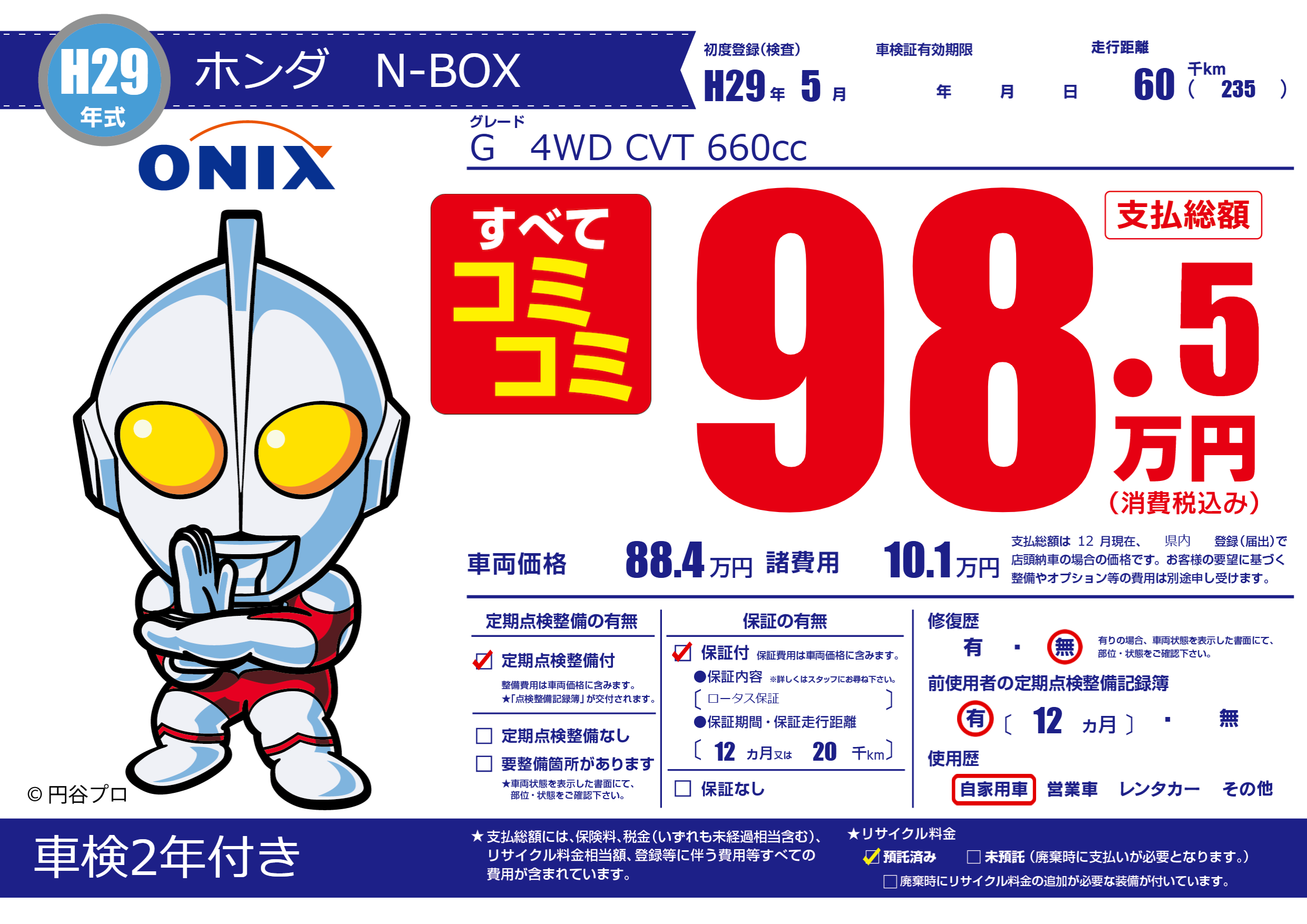 | 車名 | ホンダ N-BOX | グレード ミッション 排気量 |