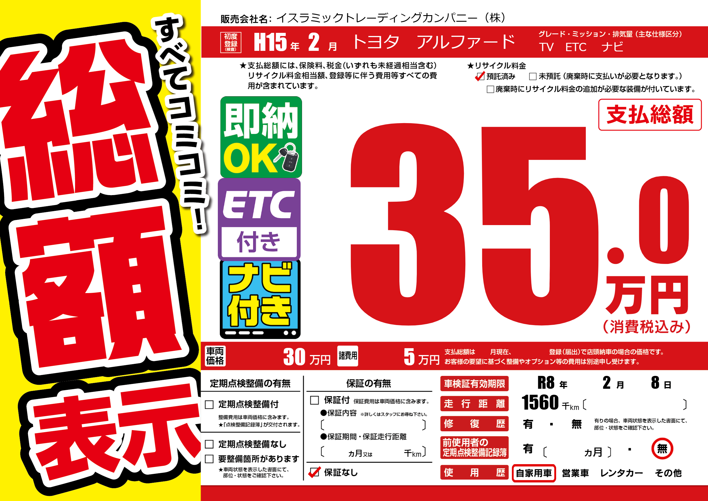 | 車名 | トヨタ アルファード | グレード ミッション 排気量 |