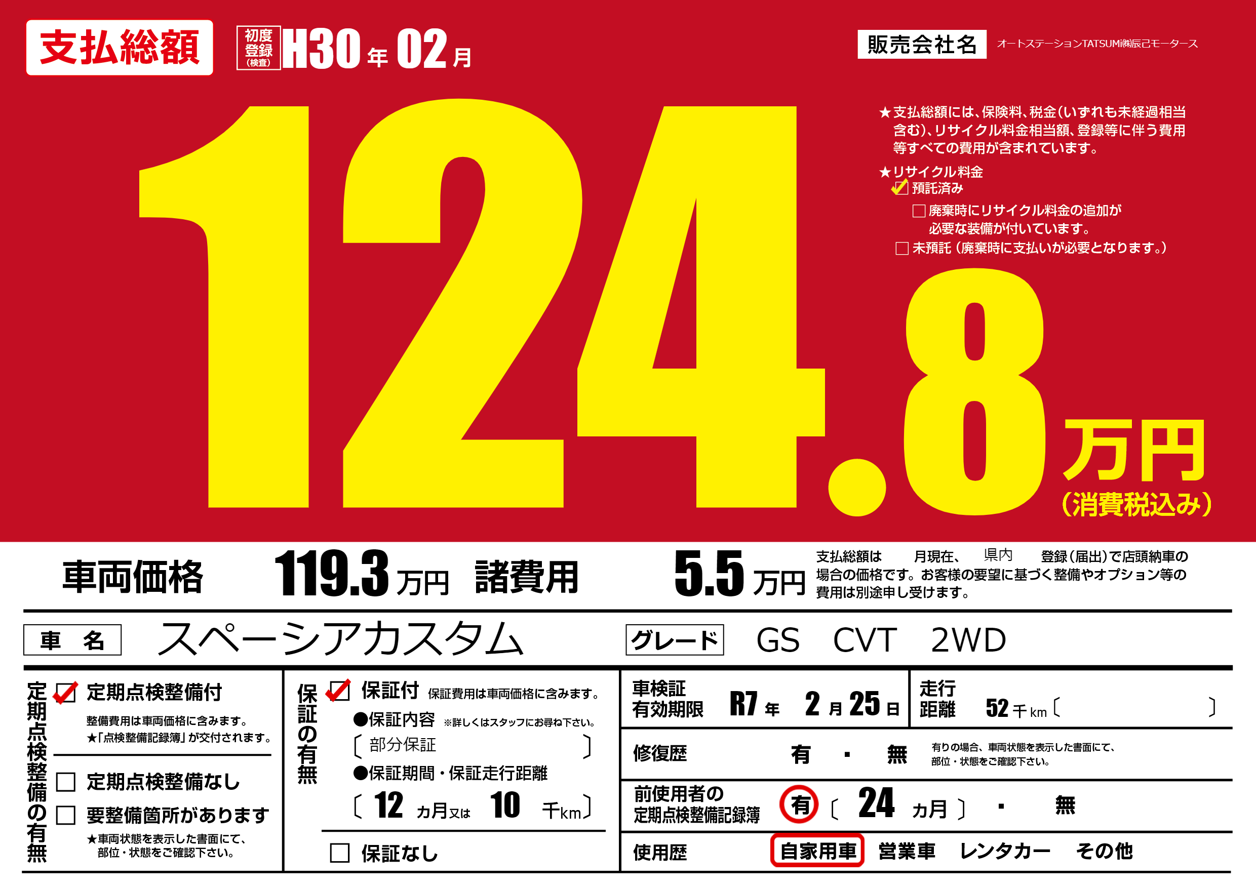 | 車名 | スペーシアカスタム | グレード ミッション 排気量 |