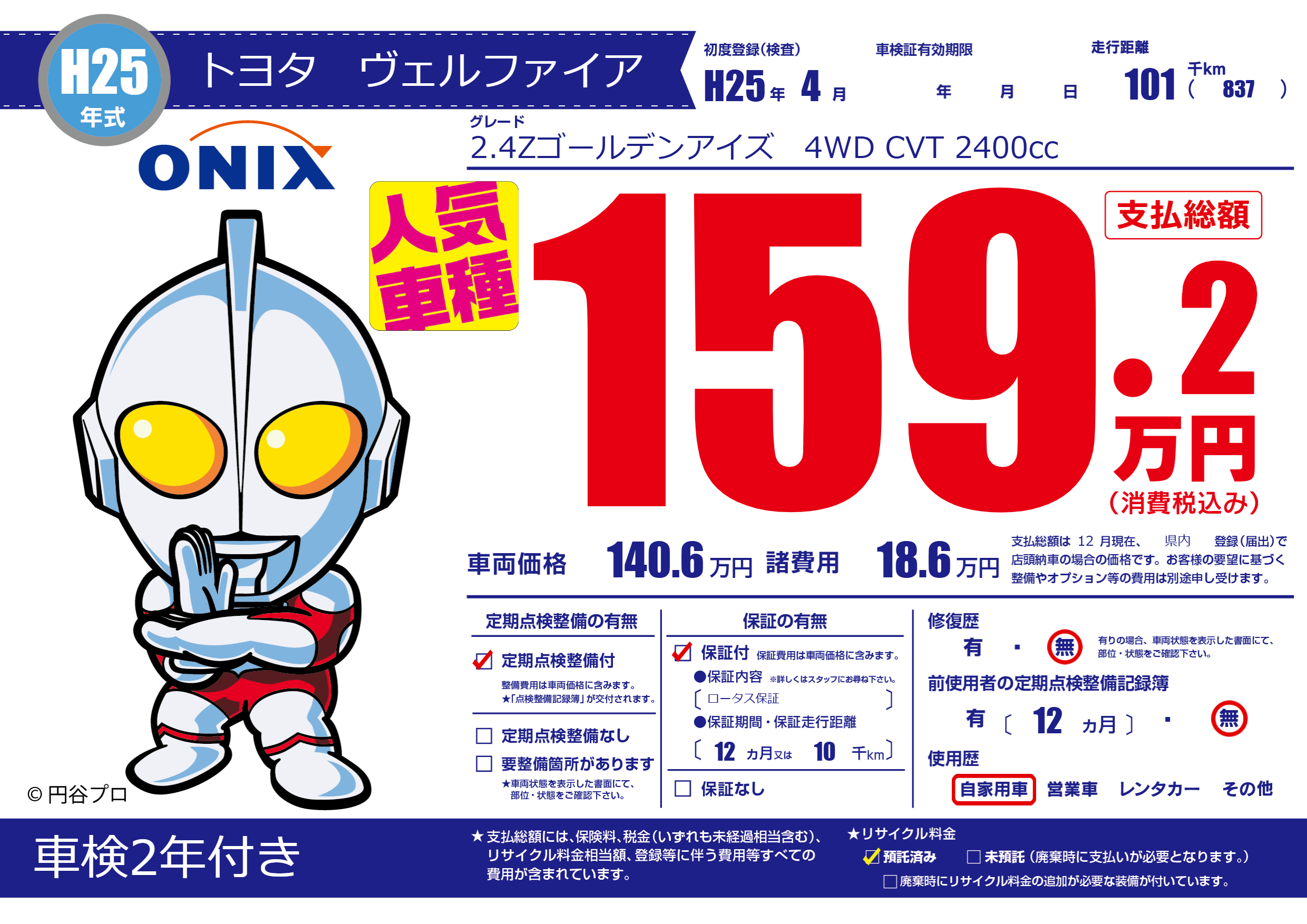 | 車名 | トヨタ ヴェルファイア | グレード ミッション 排気量 |
