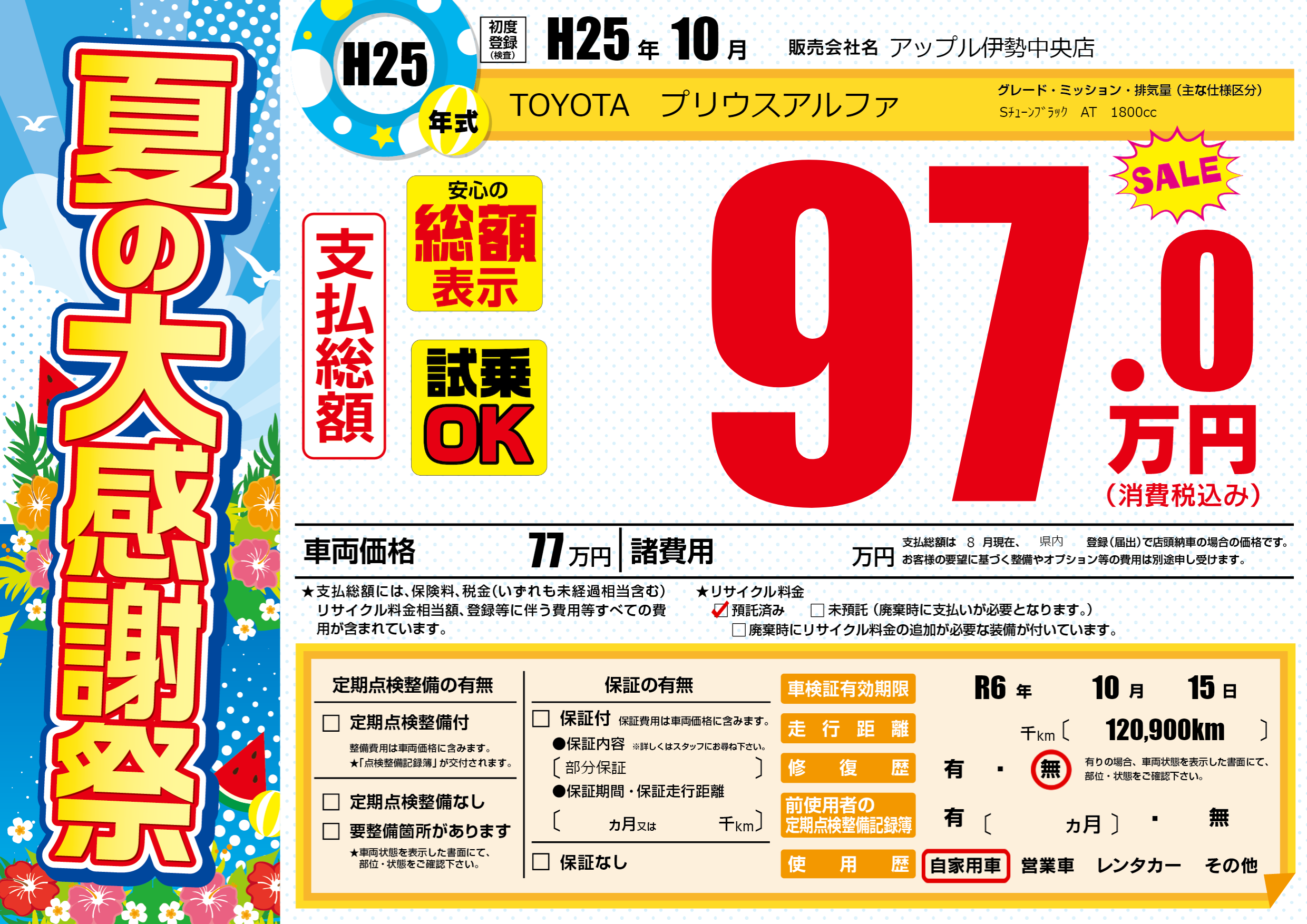 | 車名 | TOYOTA プリウスアルファ | グレード ミッション 排気量 |