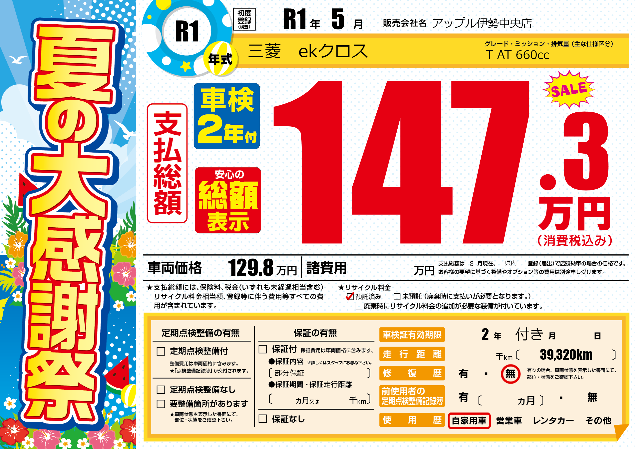 | 車名 | 三菱 ekクロス | グレード ミッション 排気量 |