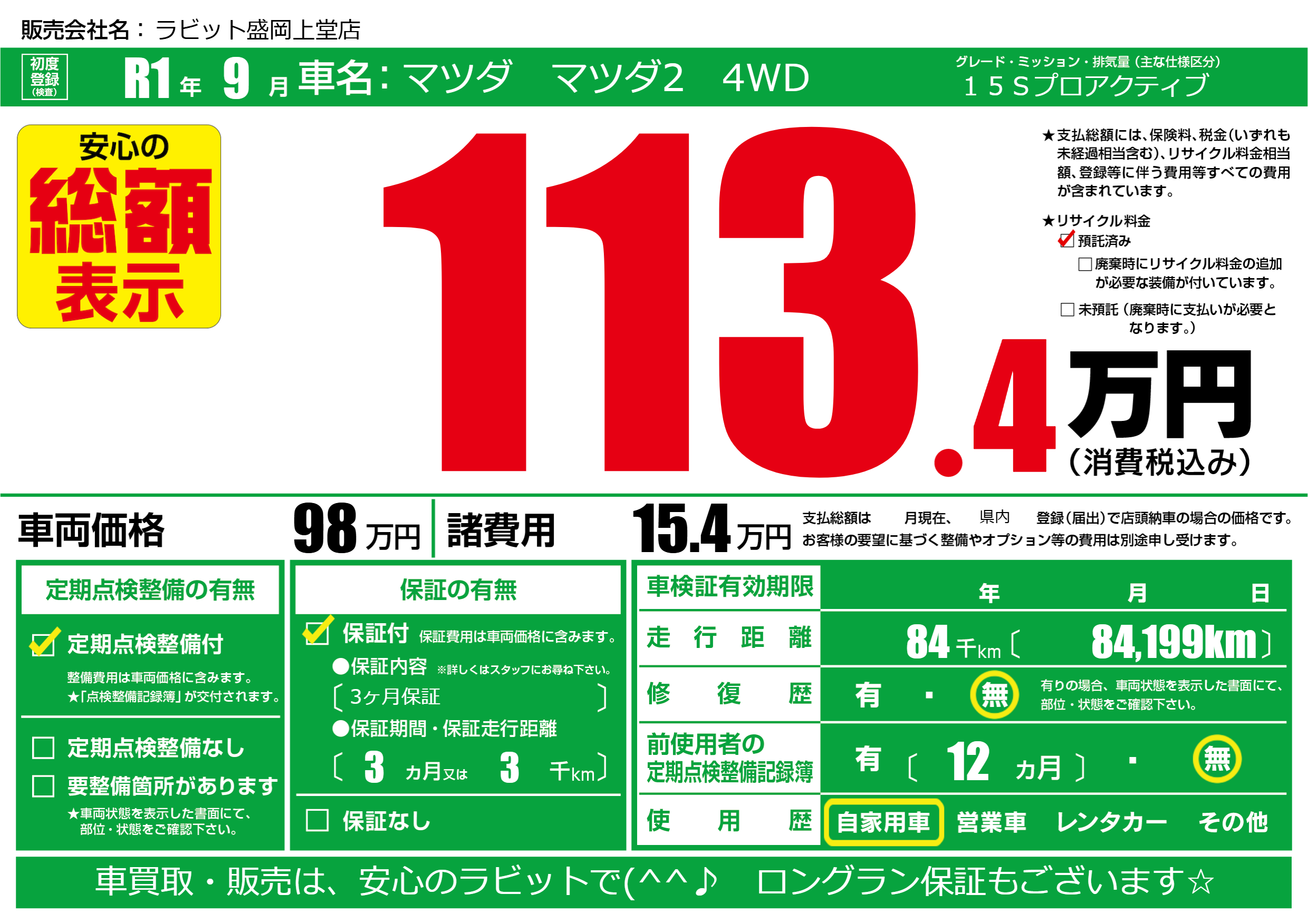 | 車名 | マツダ マツダ2 4WD | グレード ミッション 排気量 |