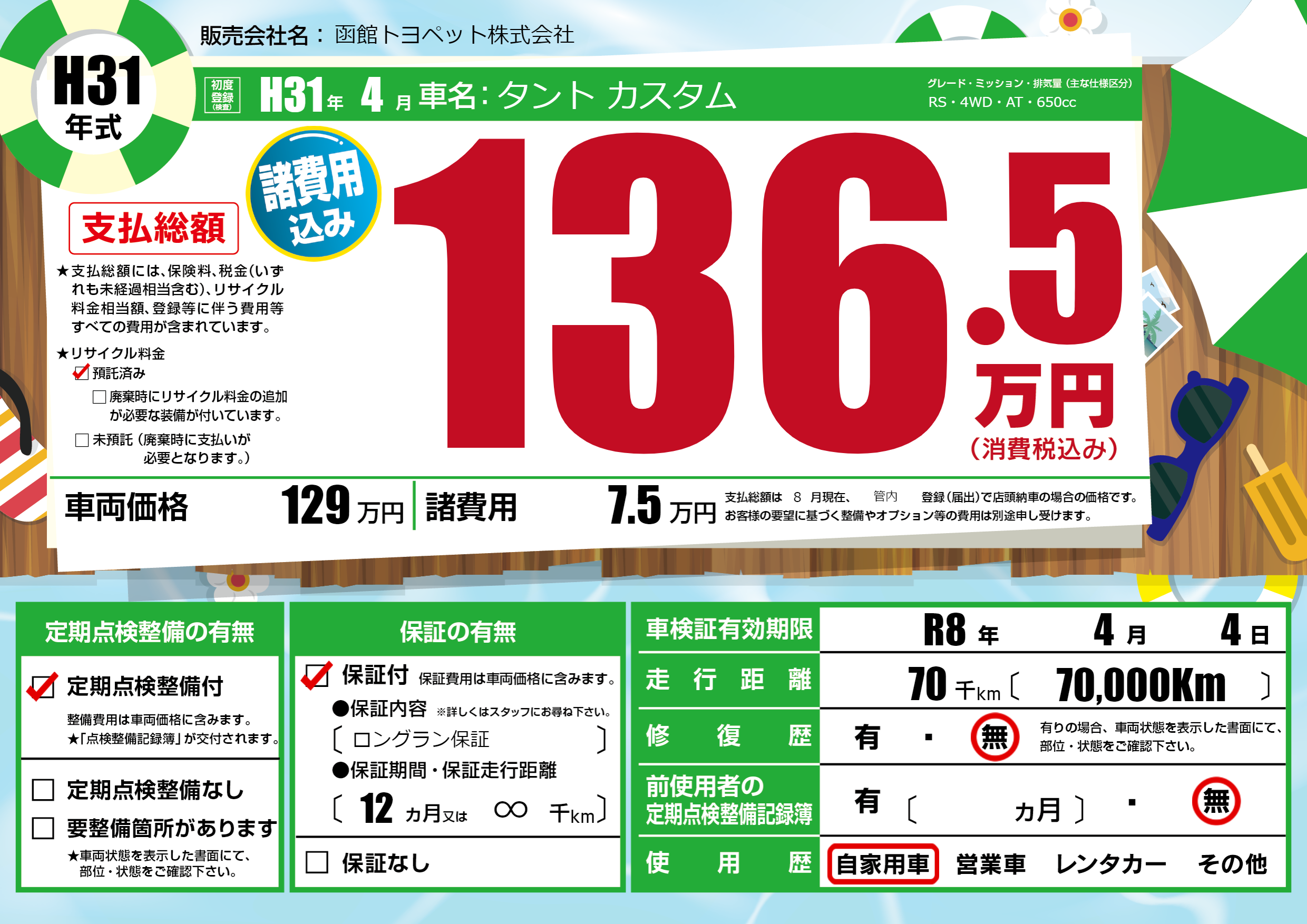 | 走行キロ | 7万km | 初年度登録 | H31年4月 |
