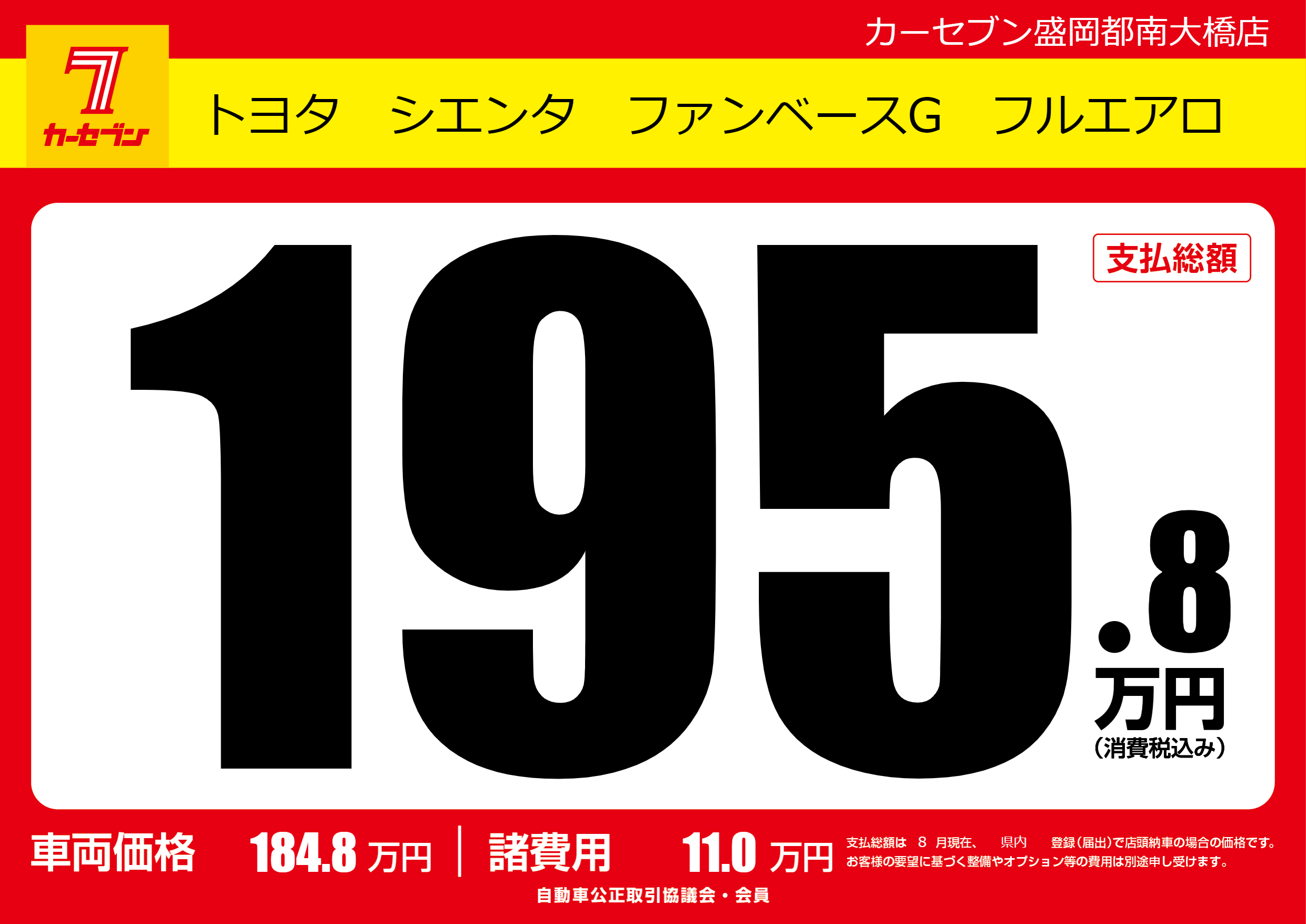 | 車名 | トヨタ シエンタ ファンベースG フルエアロ | グレード ミッション 排気量 |