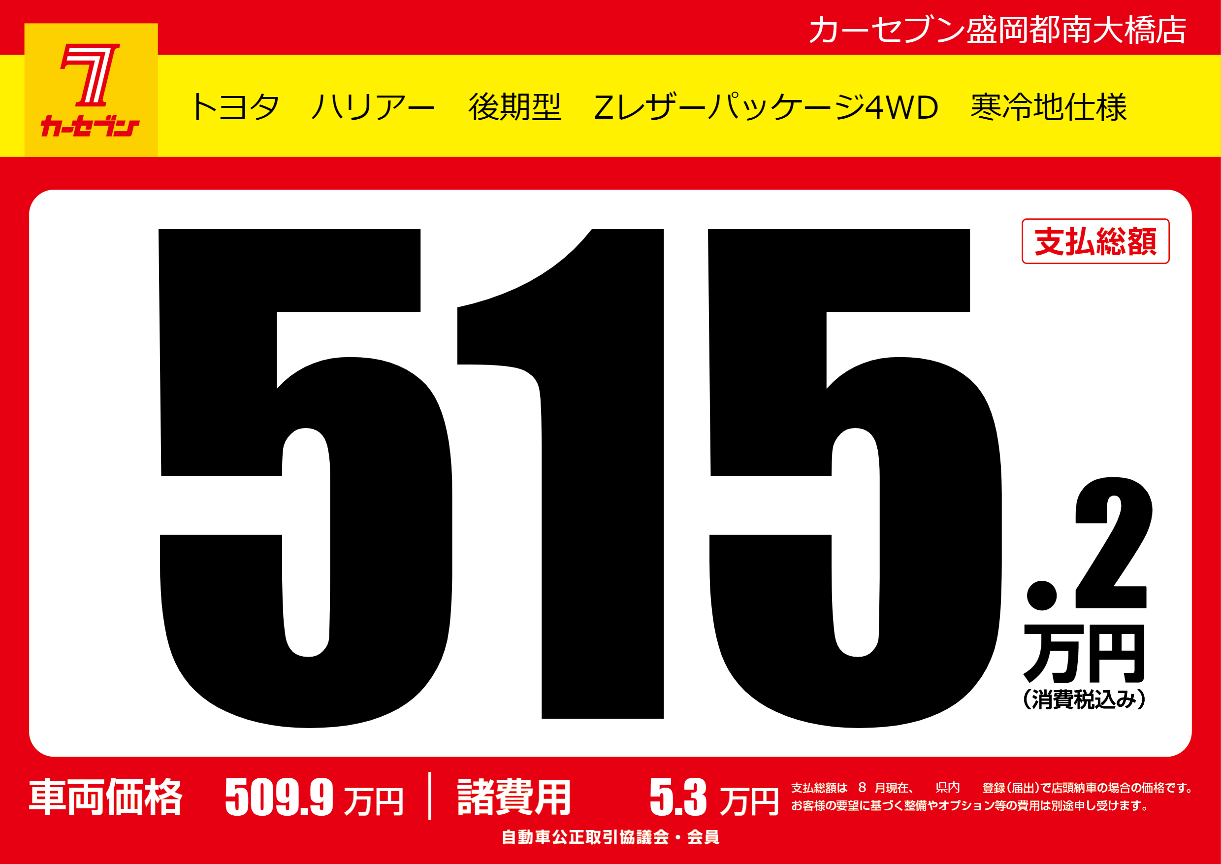 | 車名 | トヨタ ハリアー 後期型 Zレザーパッケージ4WD 寒冷地仕様 | グレード ミッション 排気量 |