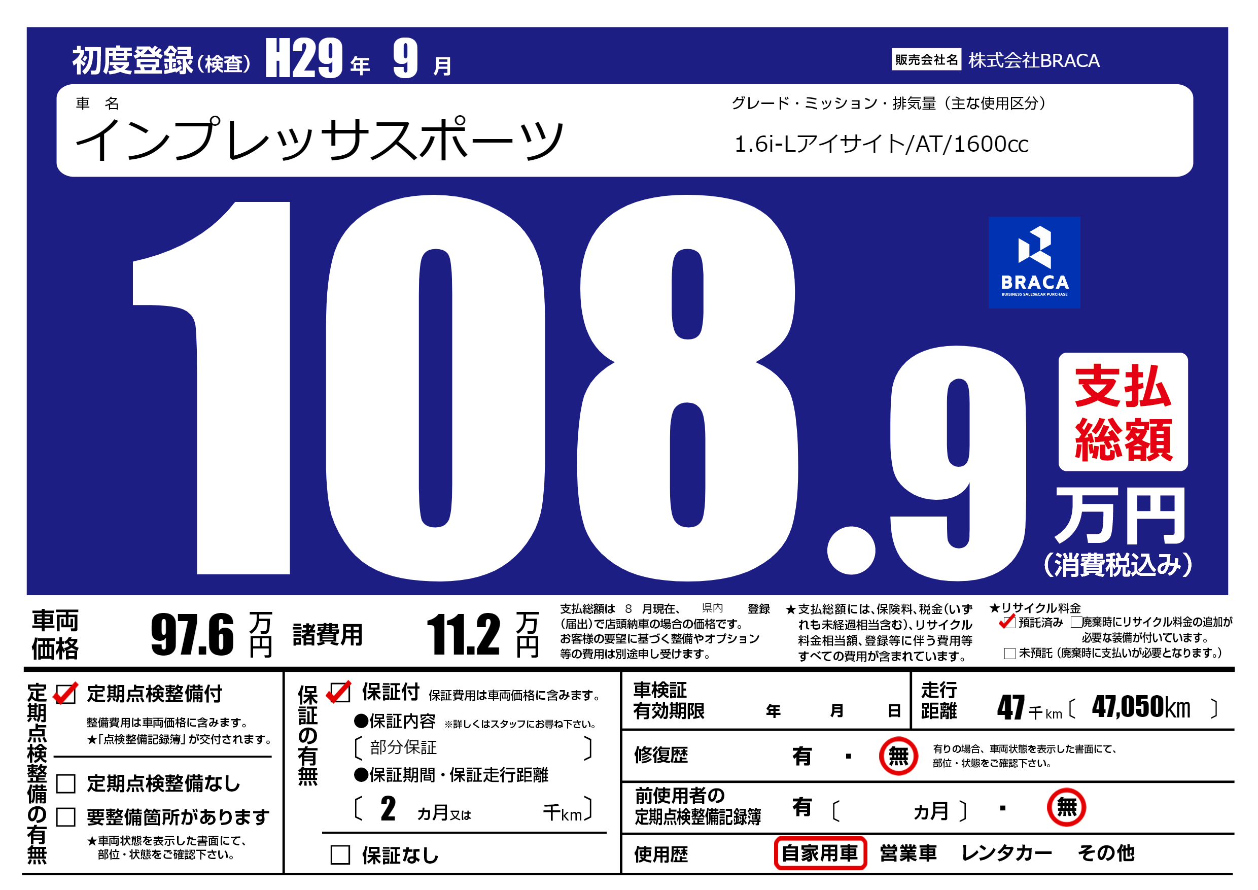 | 車名 | インプレッサスポーツ | グレード ミッション 排気量 |