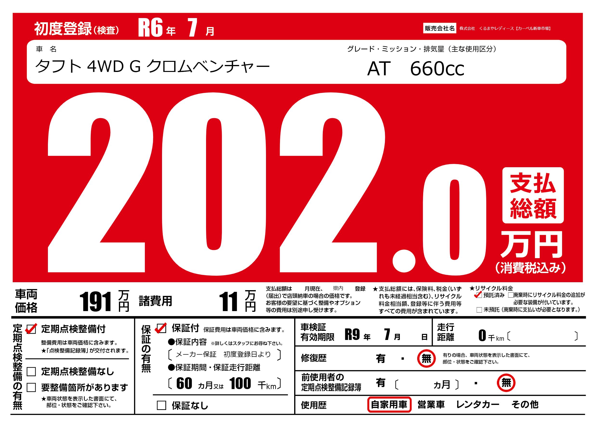 | 車名 | タフト 4WD G クロムベンチャー | グレード ミッション 排気量 |