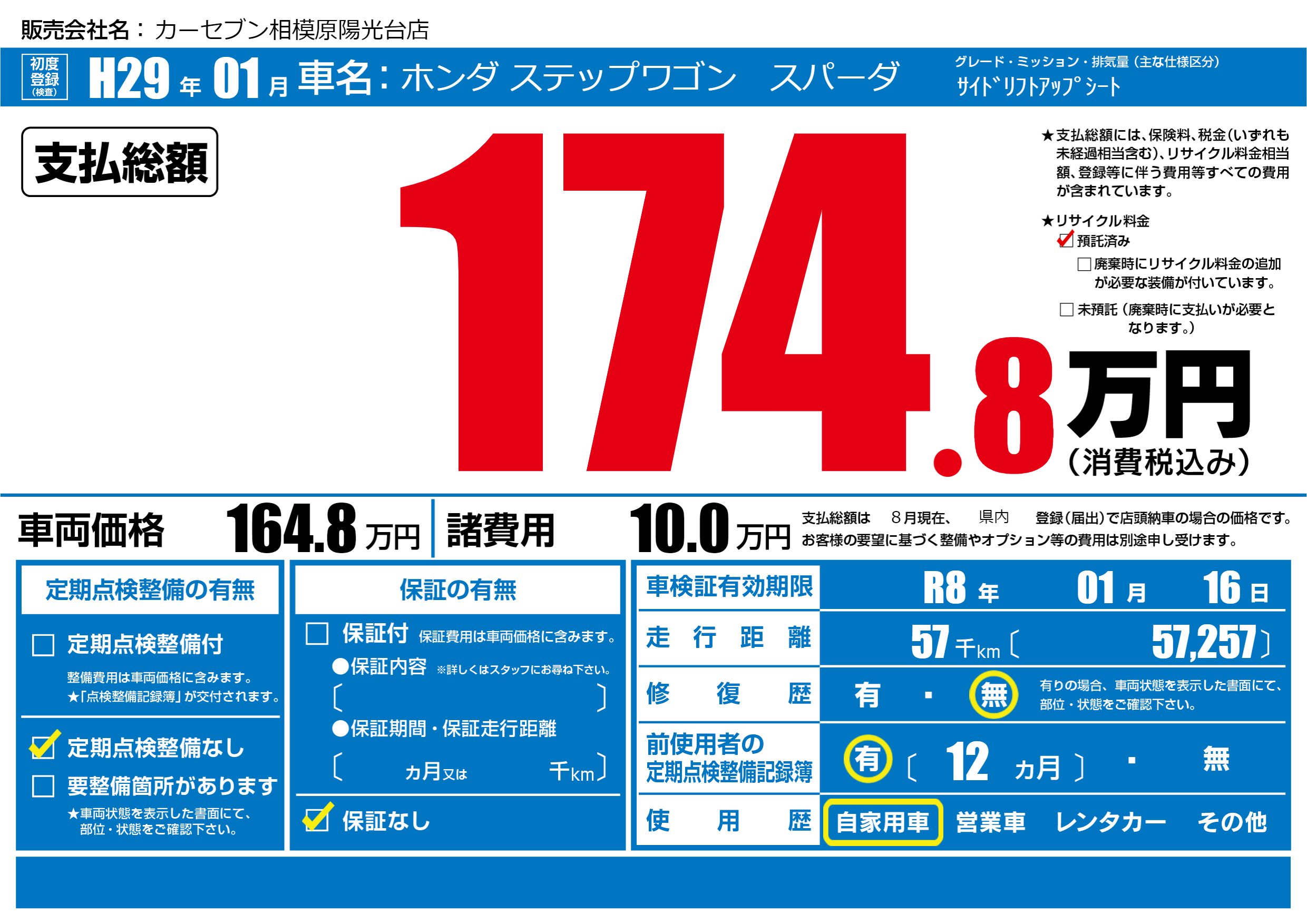 | 車名 | ホンダ ステップワゴン スパーダ | グレード ミッション 排気量 |
