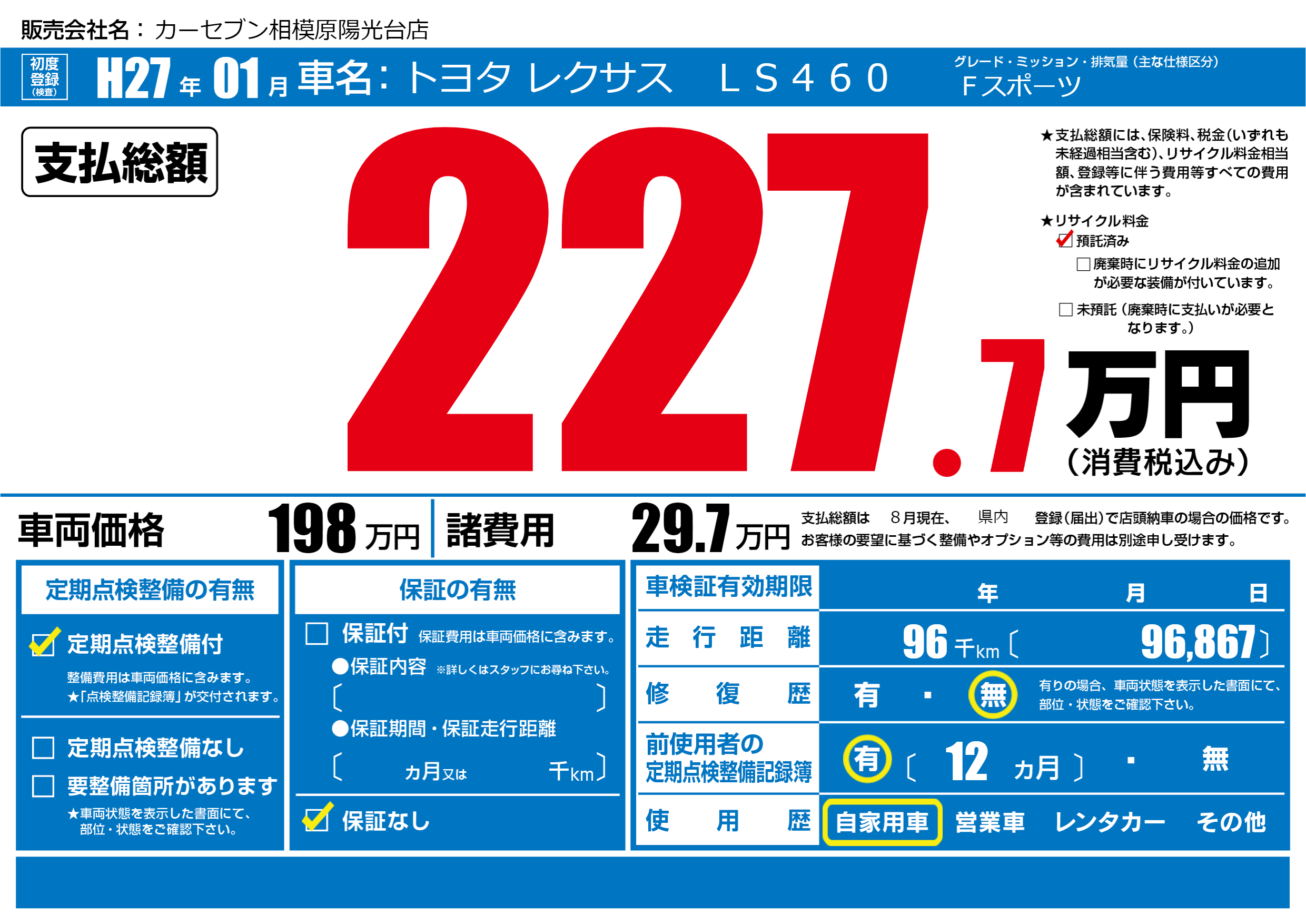 | 車名 | トヨタ レクサス LS460 | グレード ミッション 排気量 |