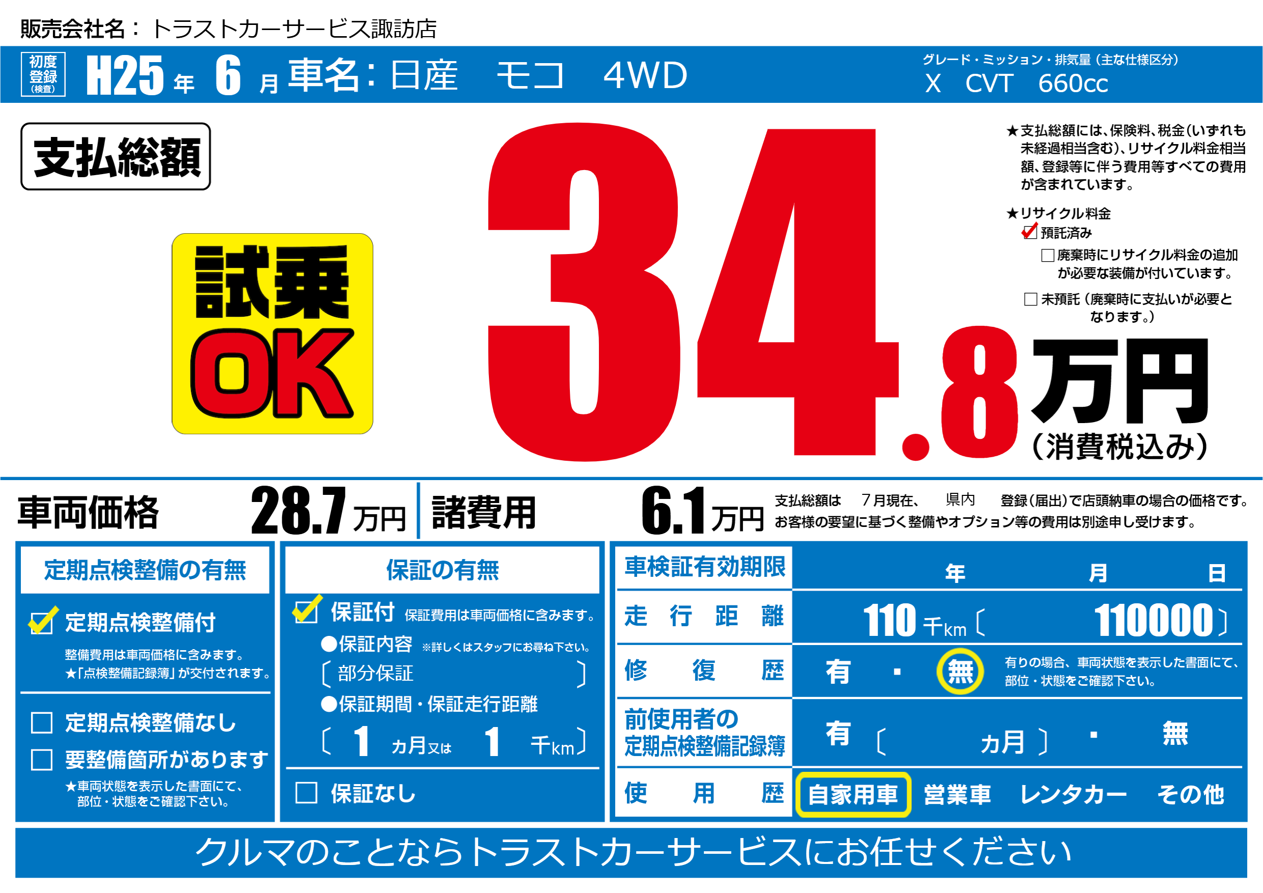 | 車名 | 日産 モコ 4WD | グレード ミッション 排気量 |