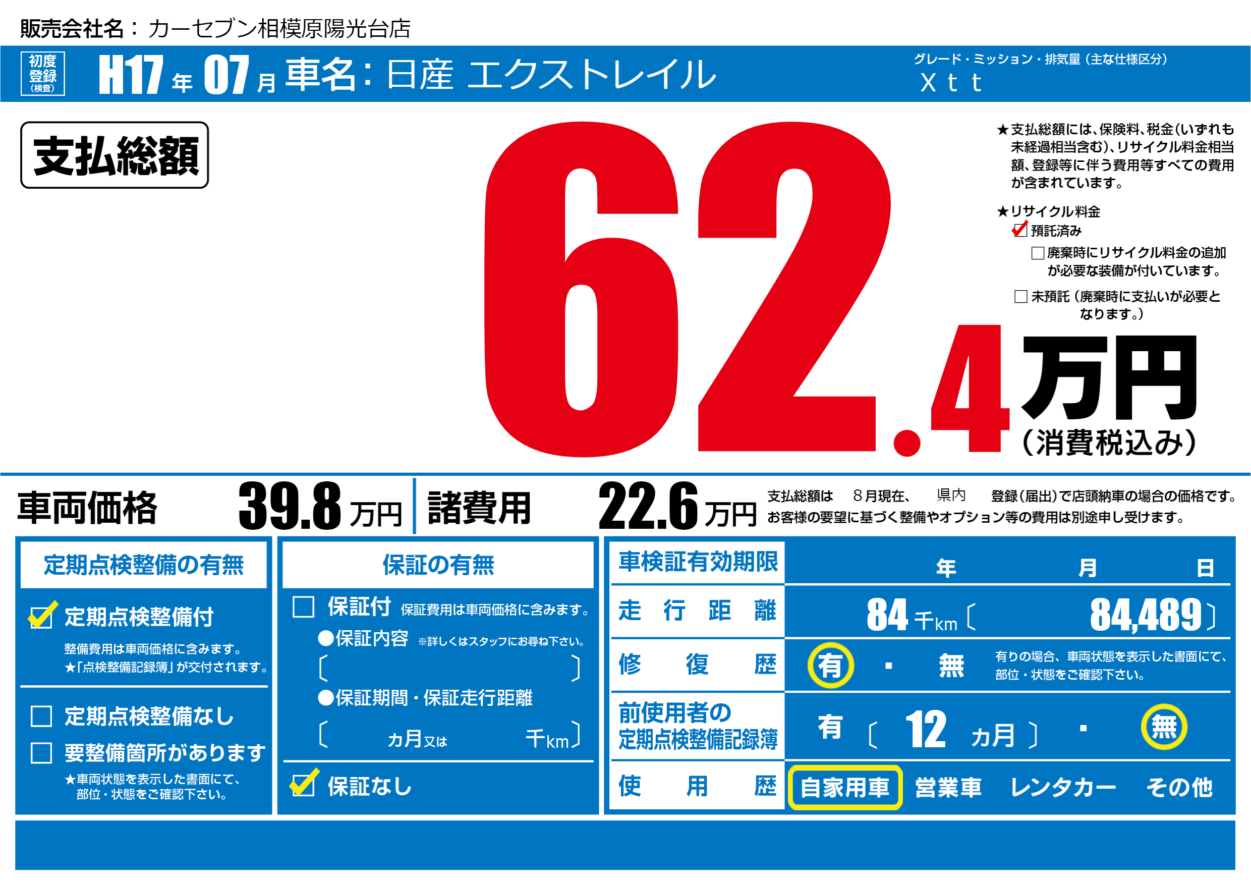 | 走行キロ | 8.4万km | 初年度登録 | H17年07月 |