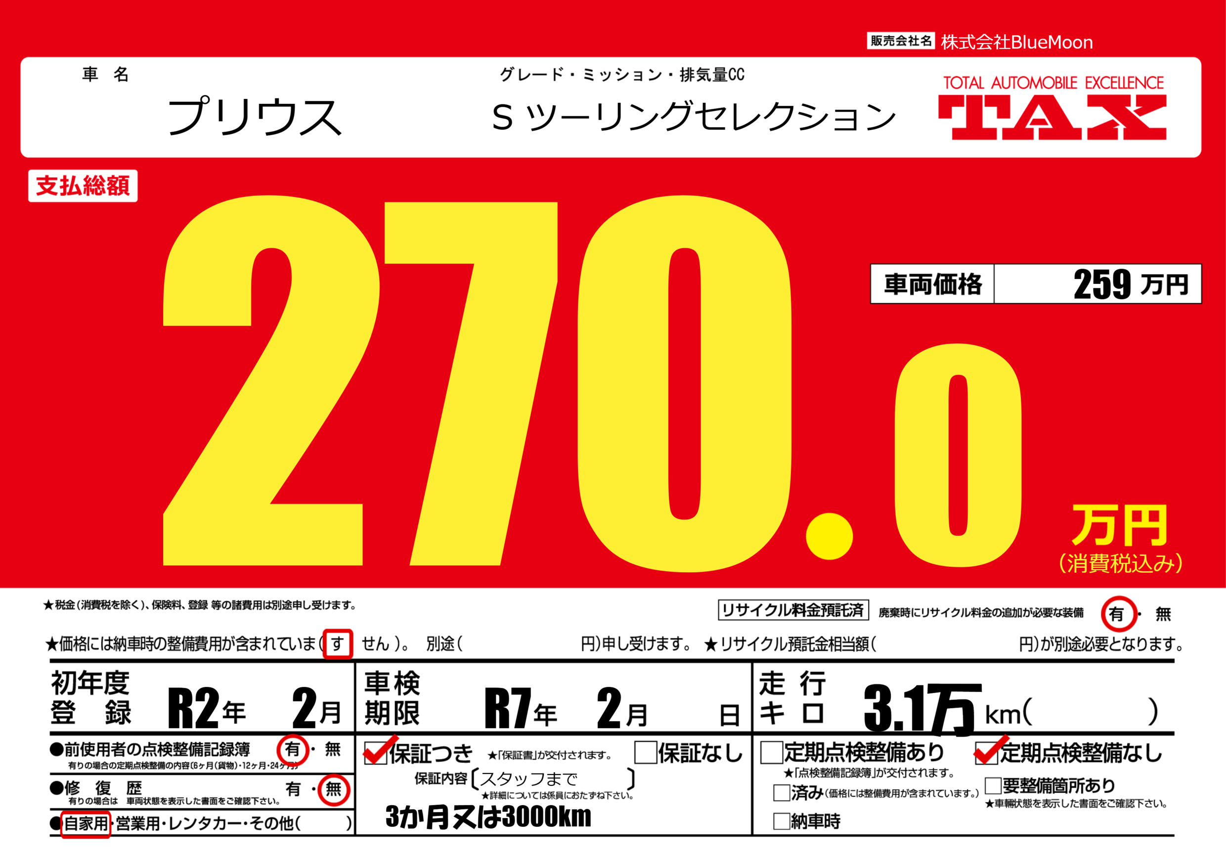 保証付き 保証内容(スタッフまで) ---ヶ月または()千kmまで |