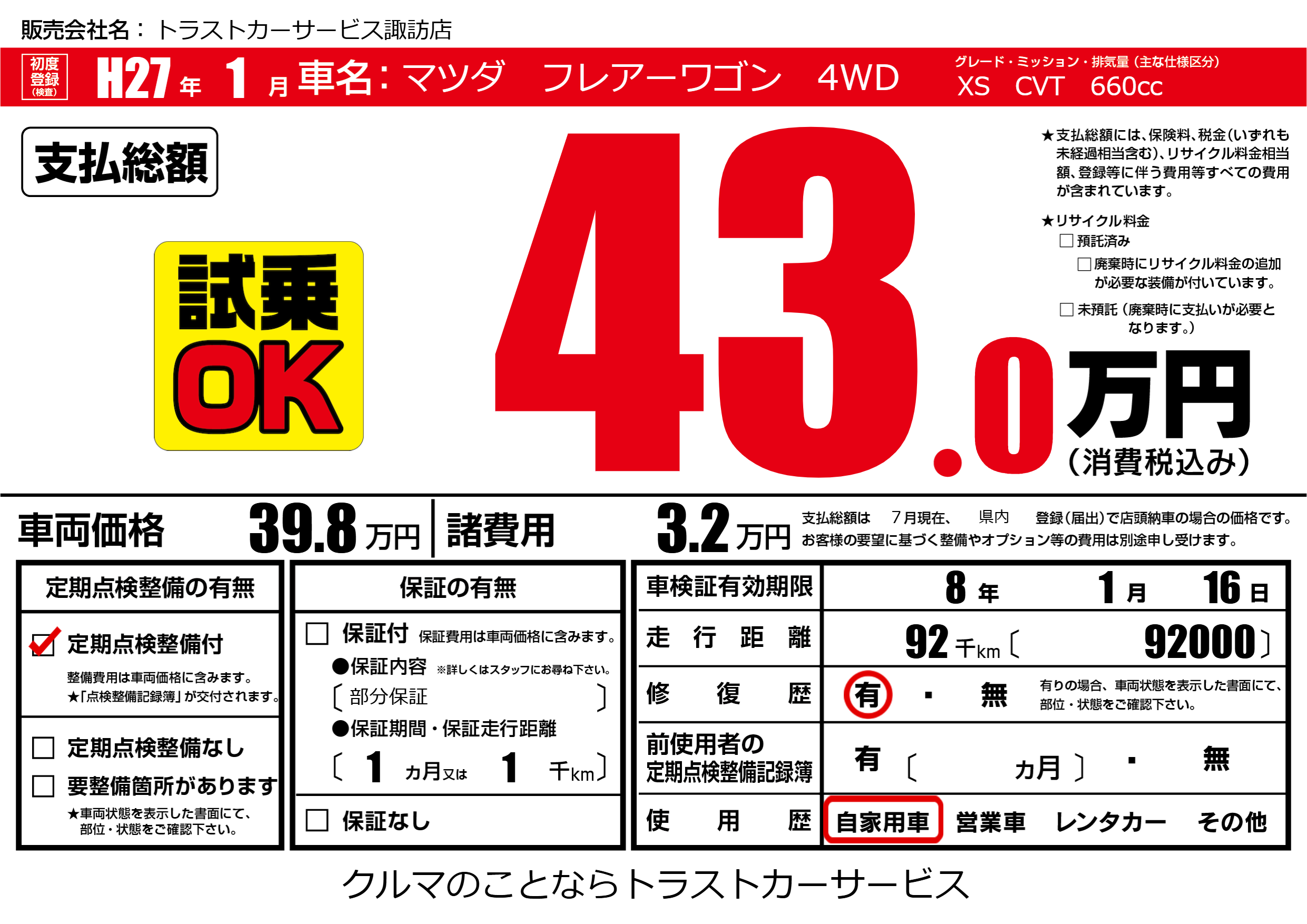 | 車名 | マツダ フレアーワゴン 4WD | グレード ミッション 排気量 |