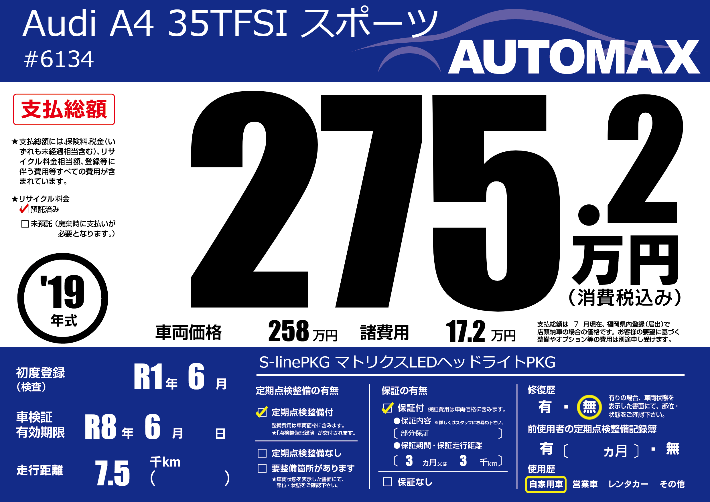 | 車名 | Audi A4 35TFSI スポーツ | グレード ミッション 排気量 |