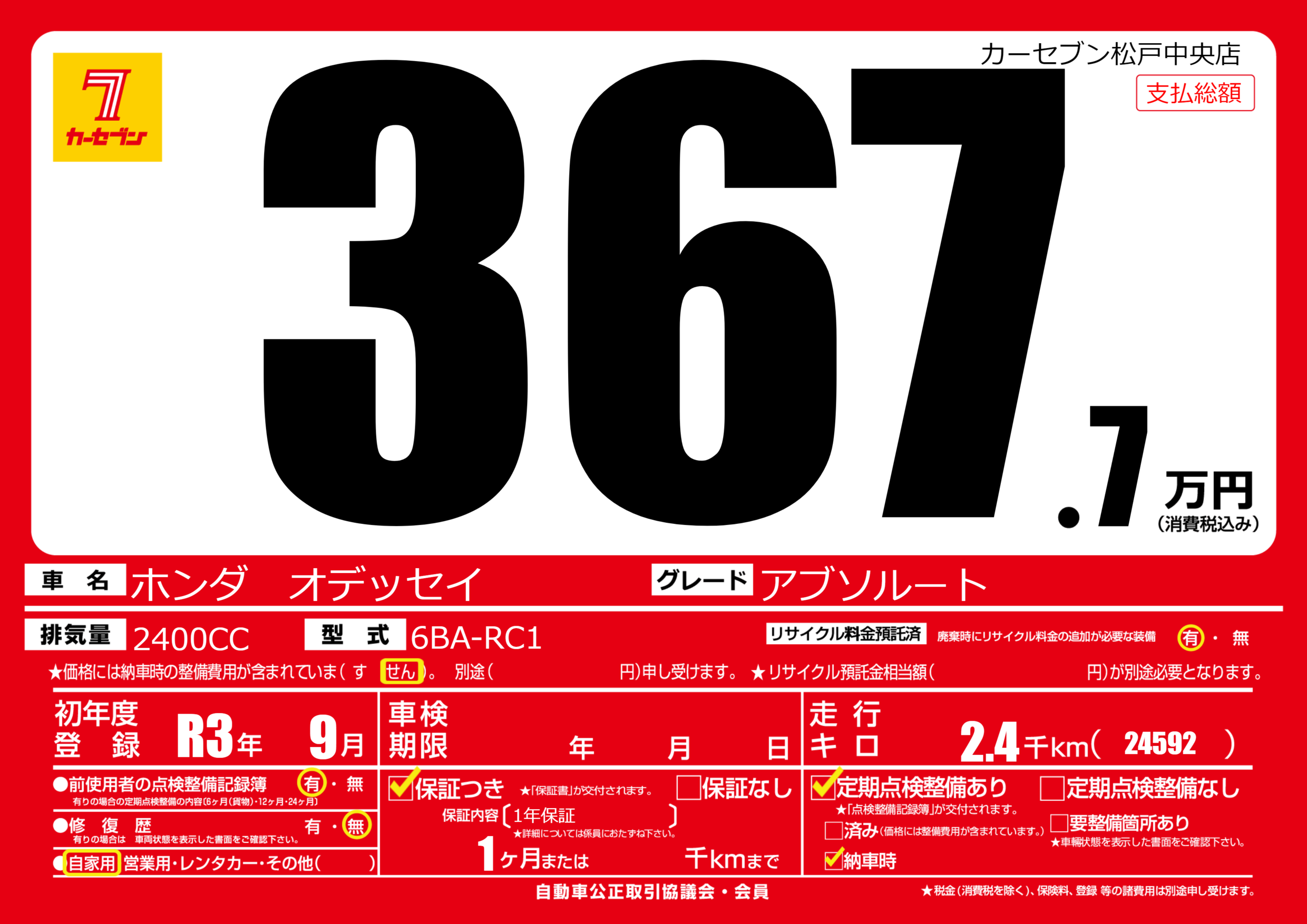 | 車名 | ホンダ オデッセイ | グレード ミッション 排気量 |