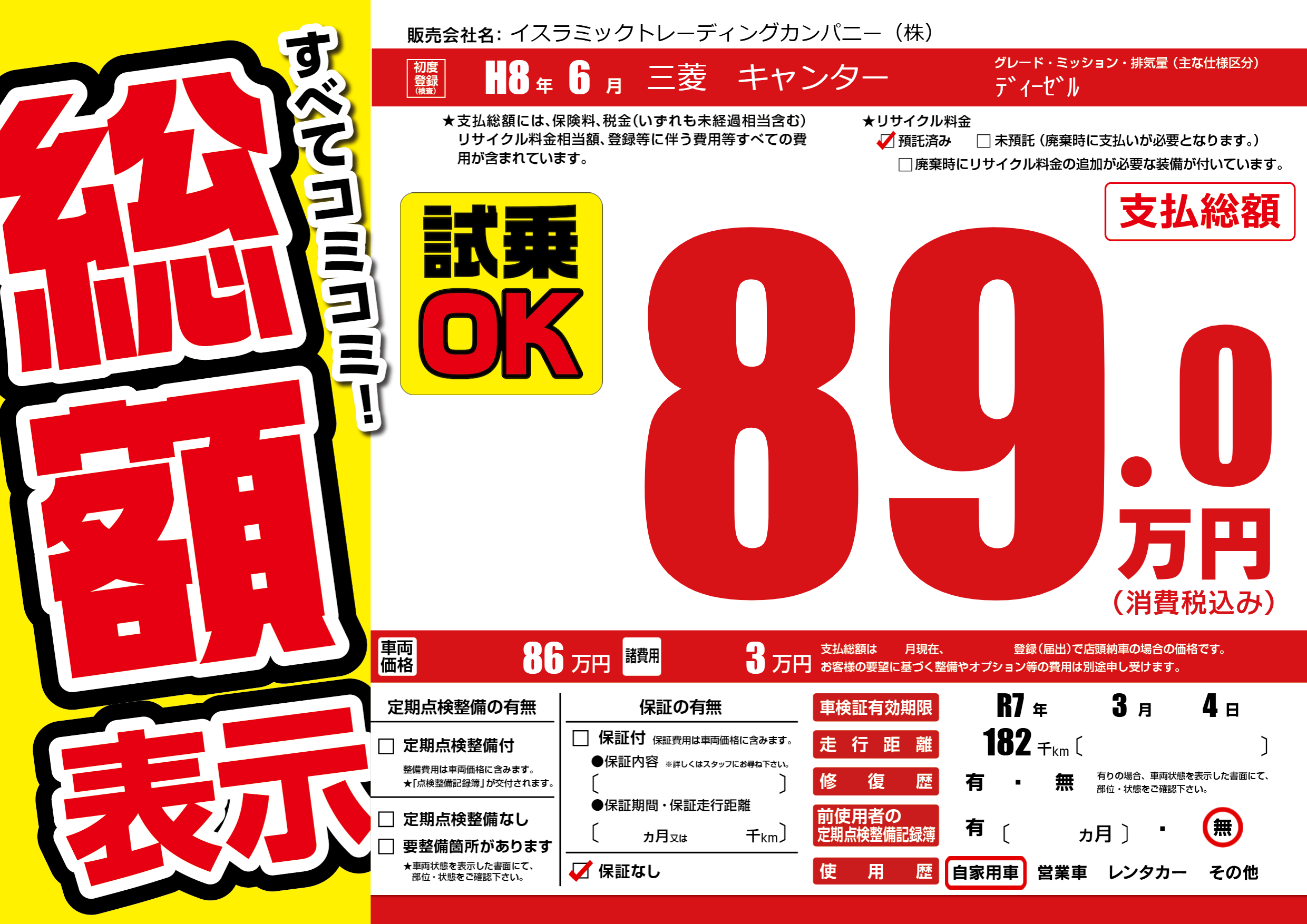 | 車名 | 三菱 キャンター | グレード ミッション 排気量 |