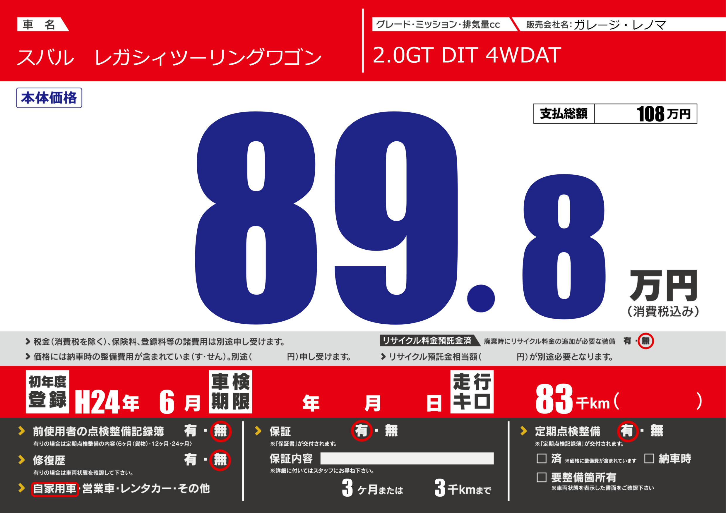 | 車名 | スバル レガシィツーリングワゴン | グレード ミッション 排気量 |