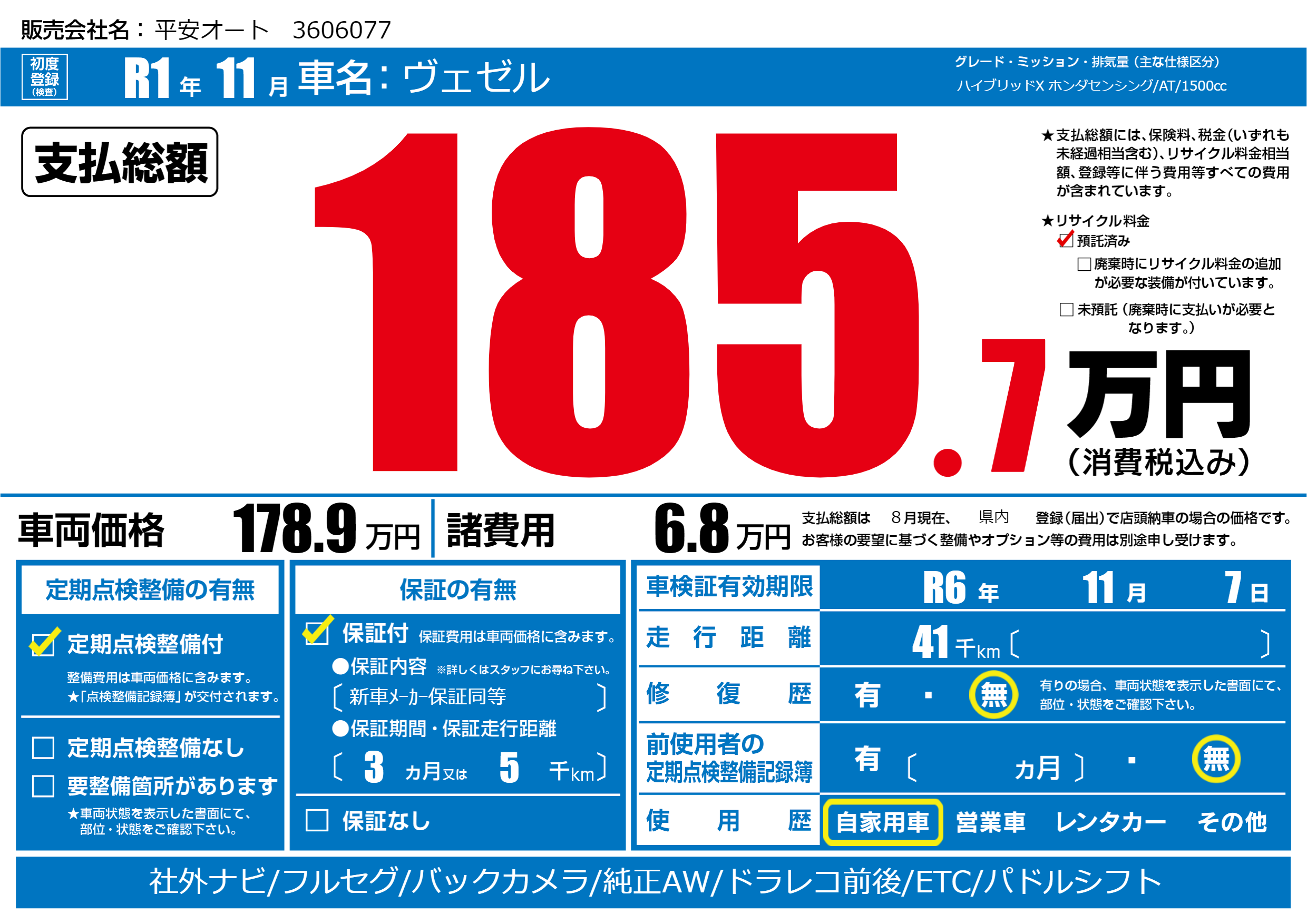 | 車検制限 | R6年 11月 7日 | ||