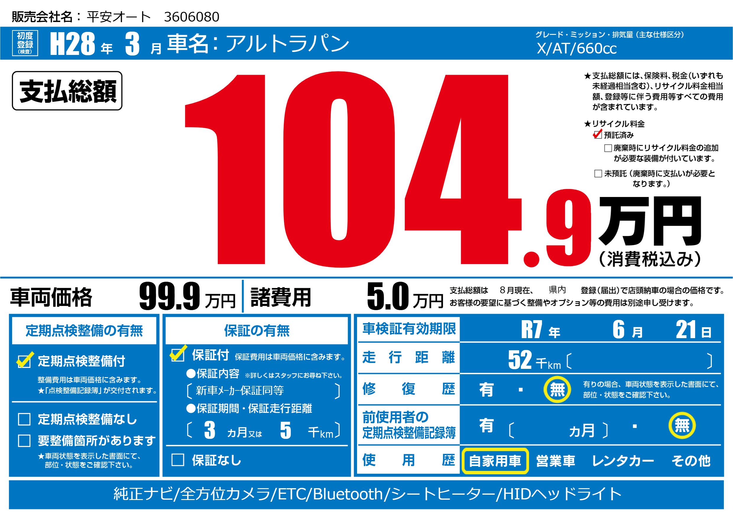 | 走行キロ | 5.2万km | 初年度登録 | H28年3月 |