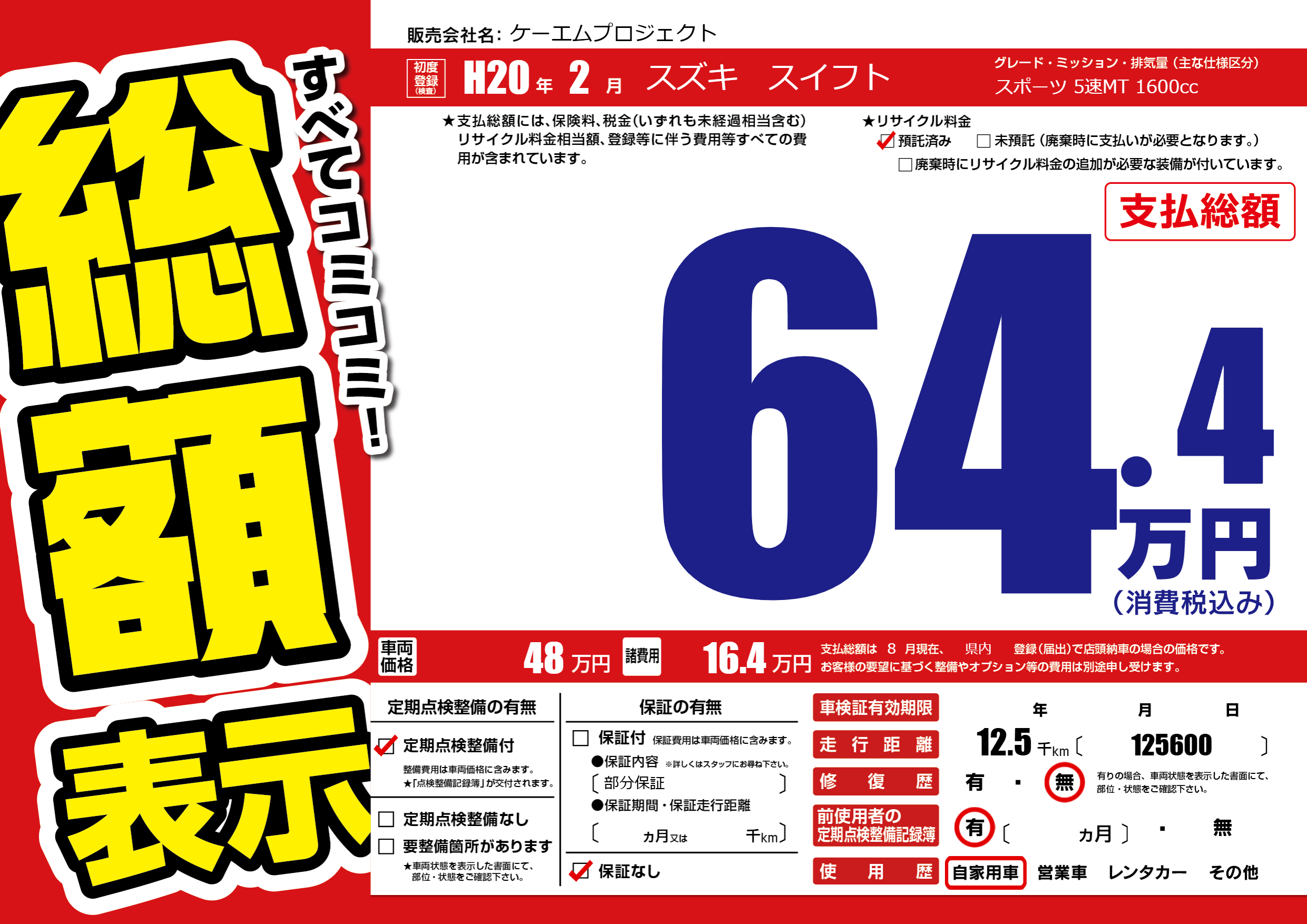 | 車名 | スズキ スイフト | グレード ミッション 排気量 |