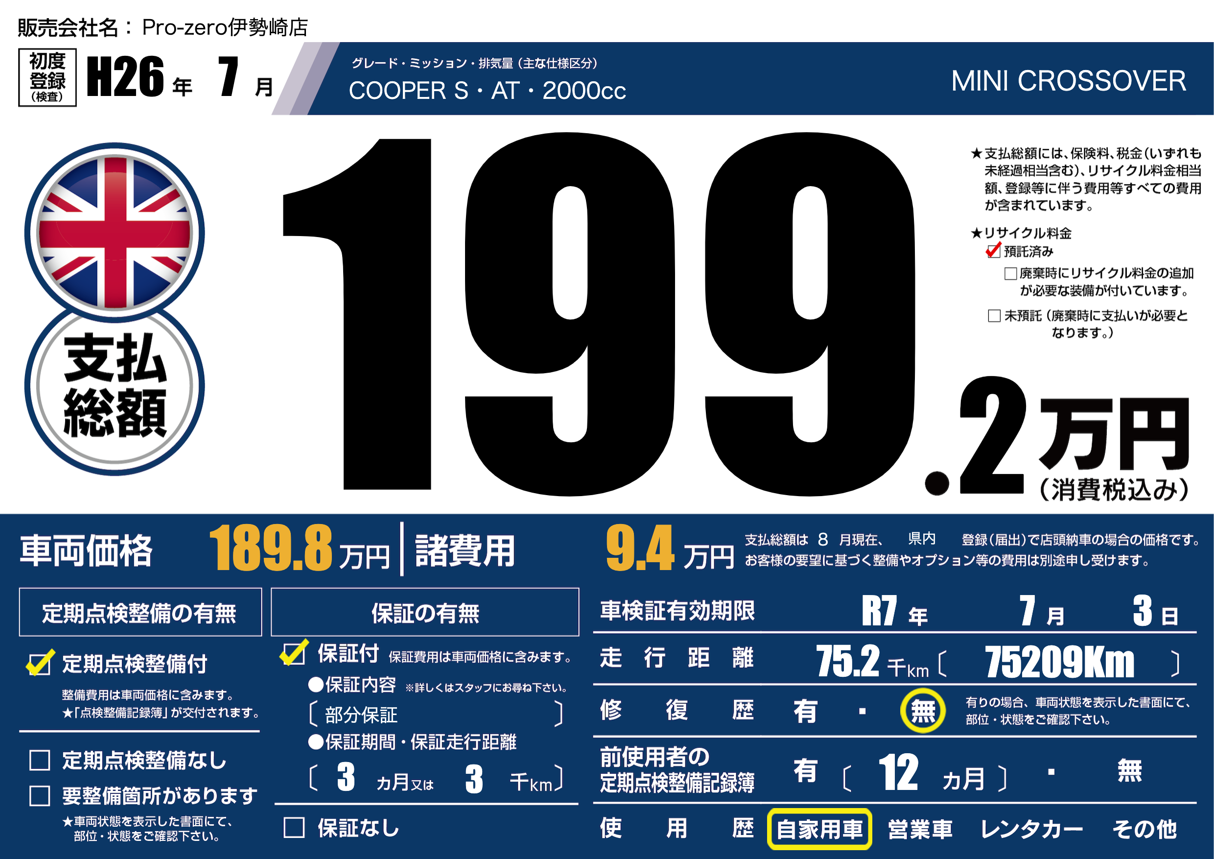 | 走行キロ | 7.5万km | 初年度登録 | H26年7月 |