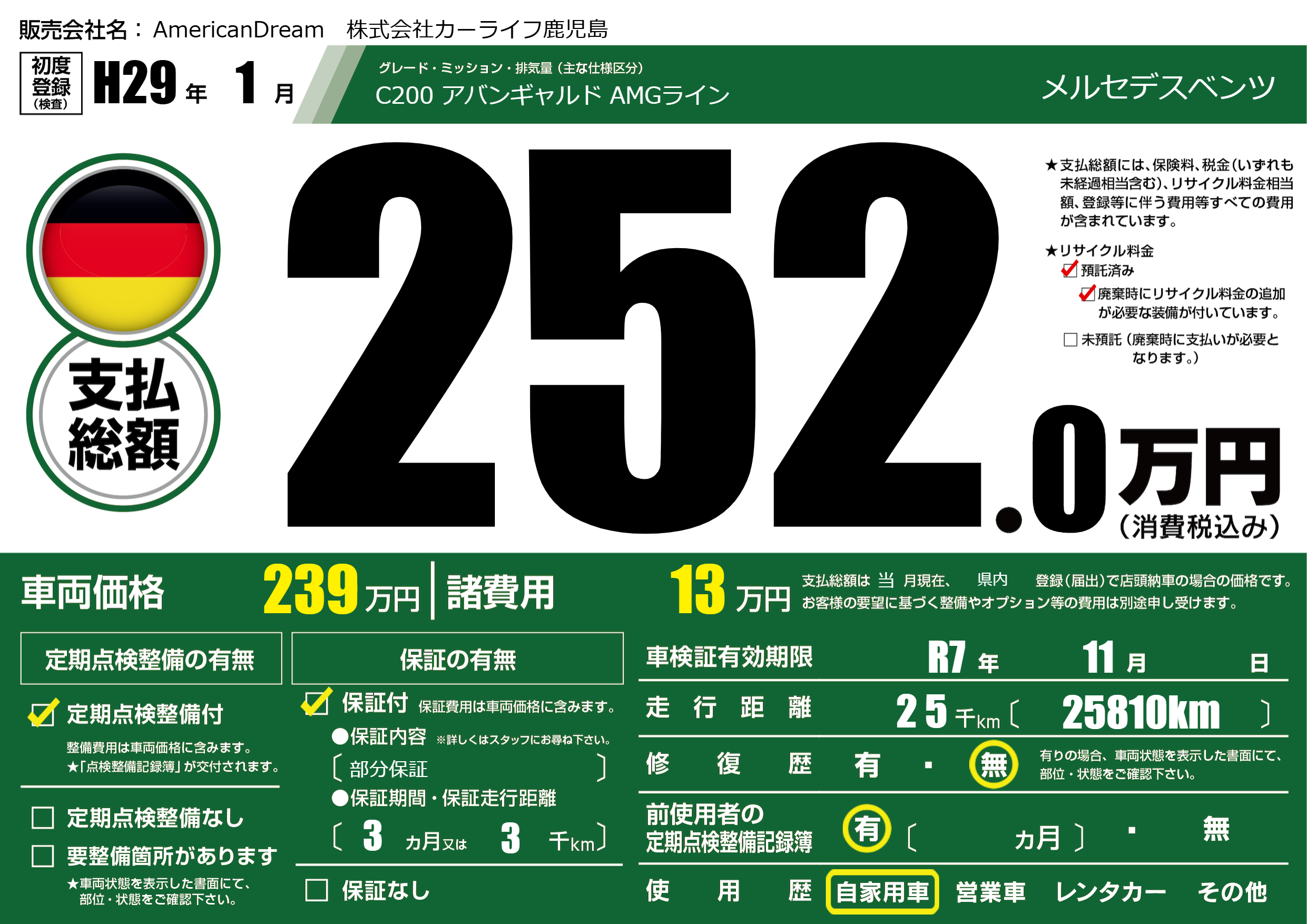 | 車名 | メルセデスベンツ | グレード ミッション 排気量 |