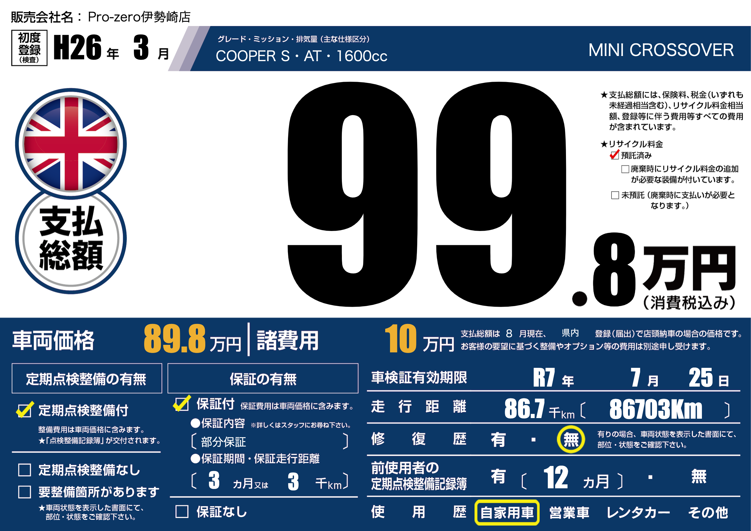 | 車名 | MINI CROSSOVER | グレード ミッション 排気量 |