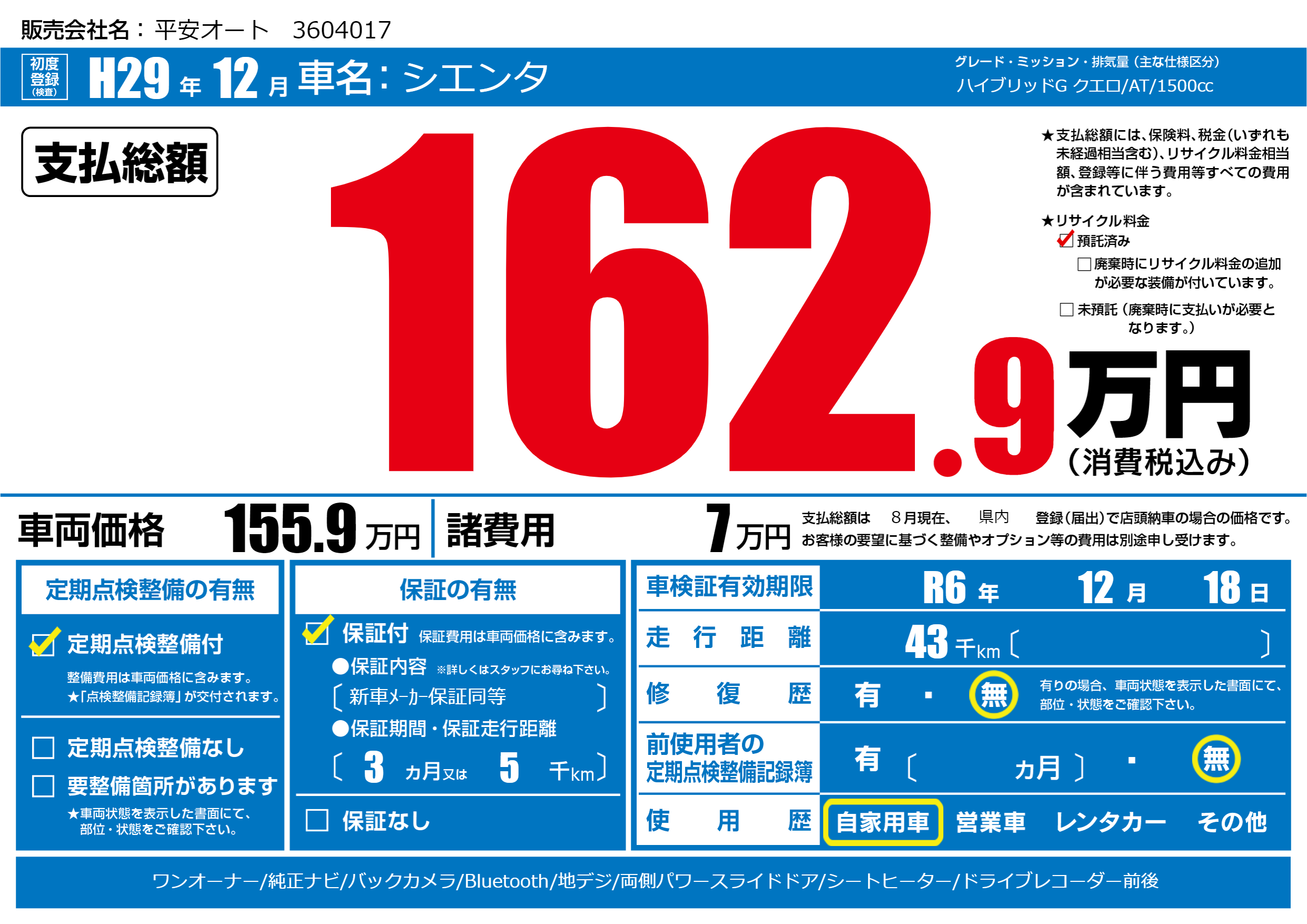 | 車検制限 | R6年 12月 18日 | ||