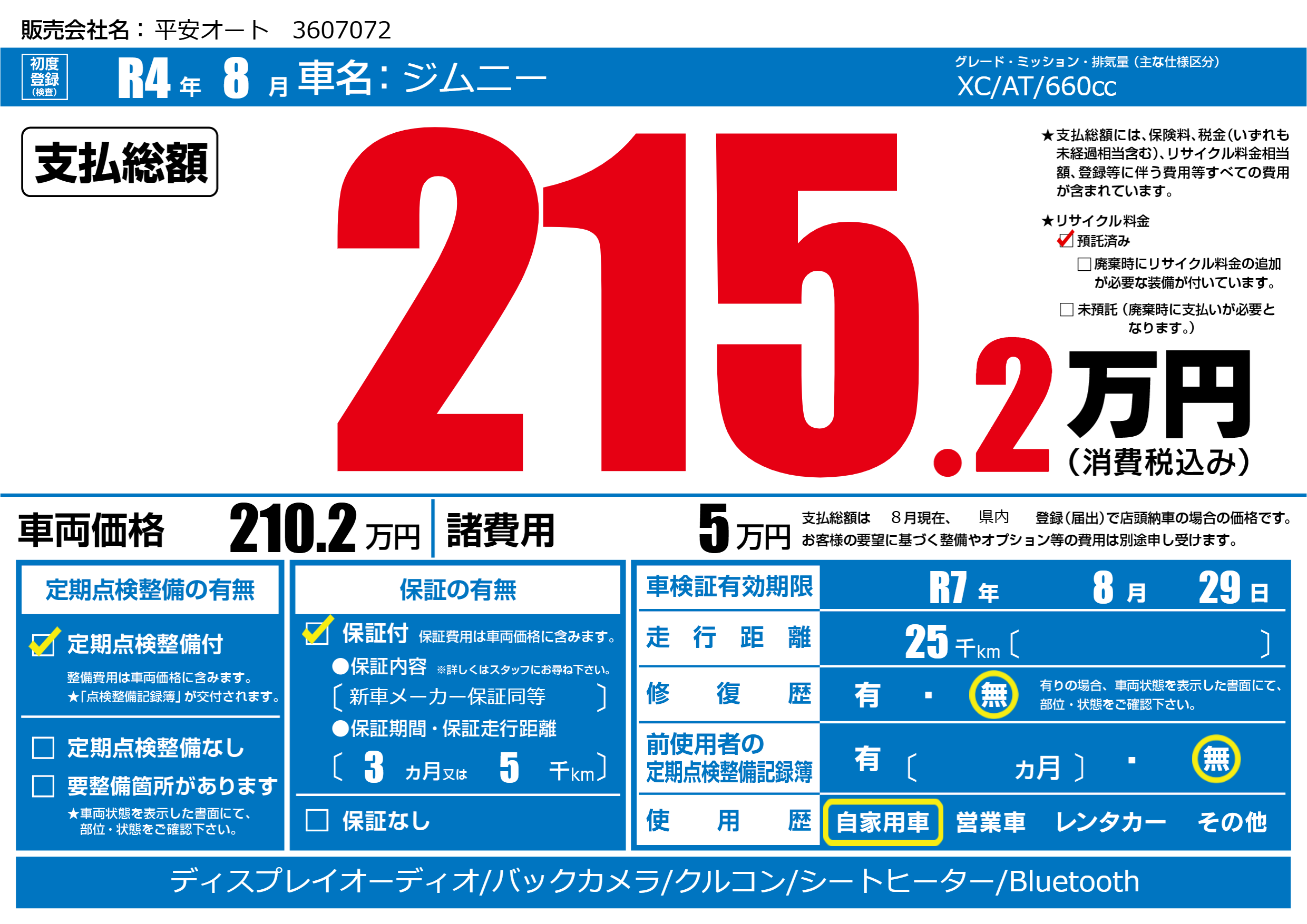 | 走行キロ | 2.5万km | 初年度登録 | R4年8月 |