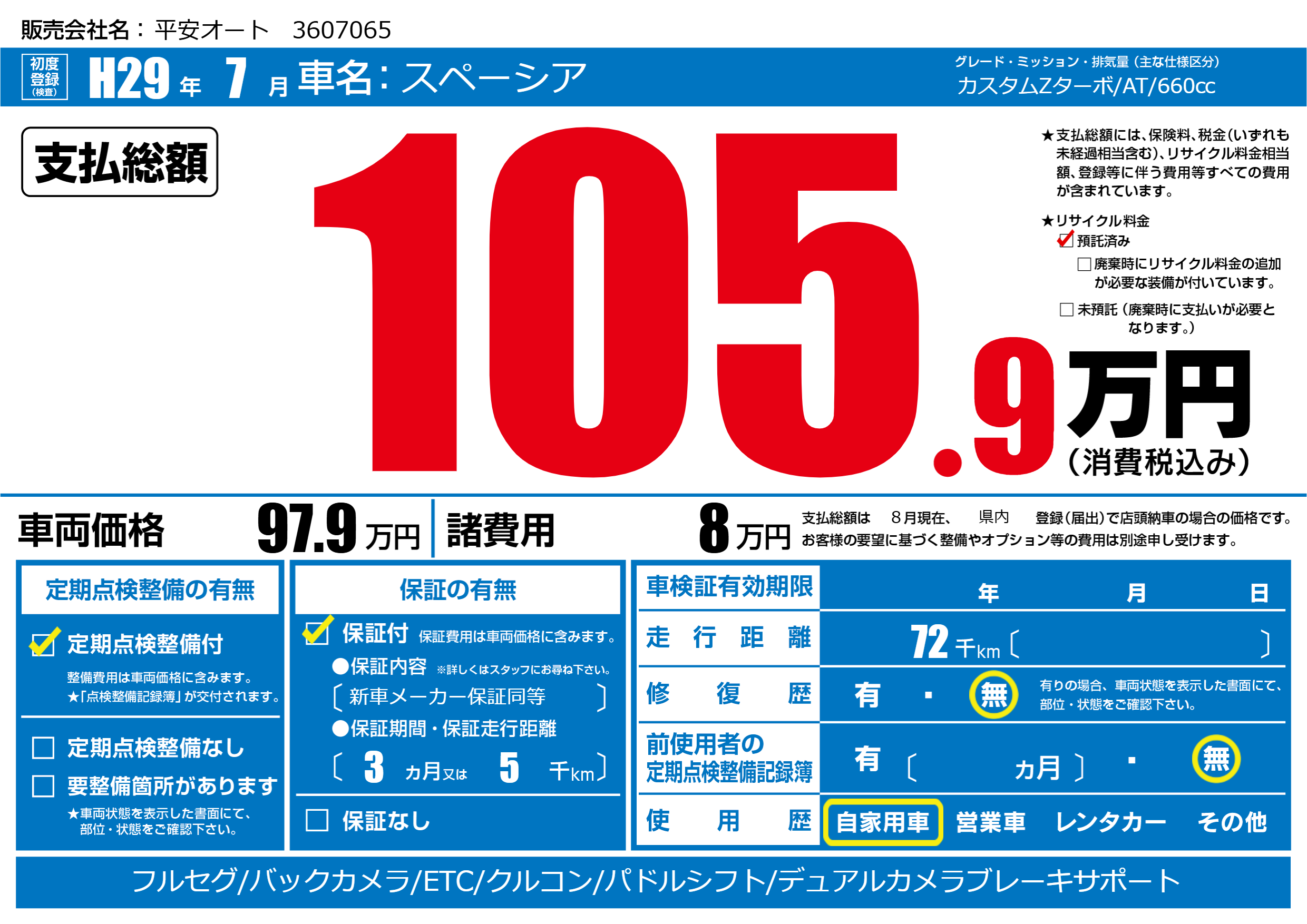 | 車名 | スペーシア | グレード ミッション 排気量 |